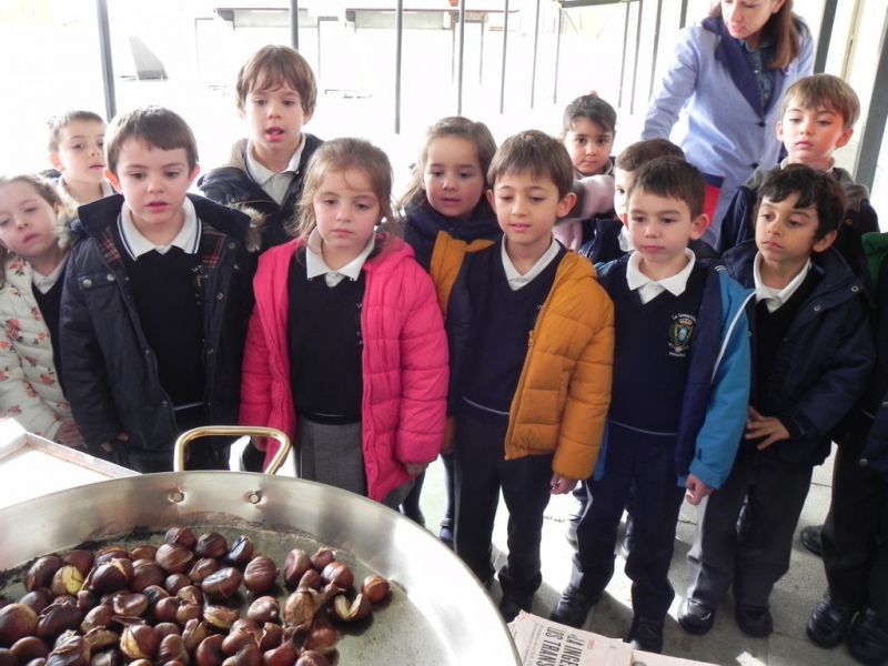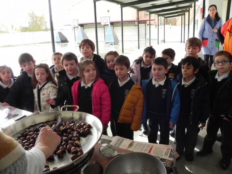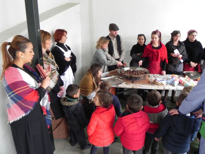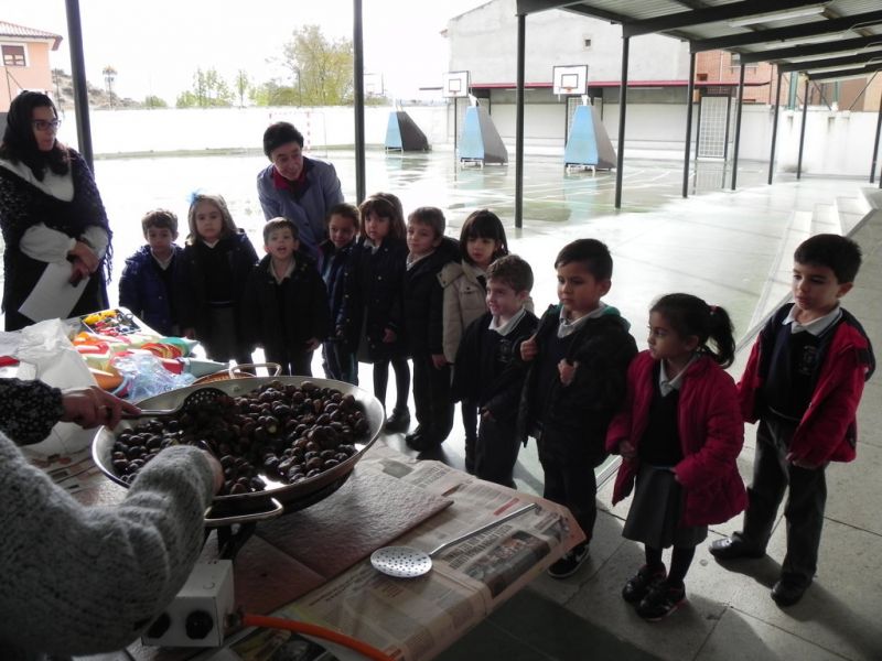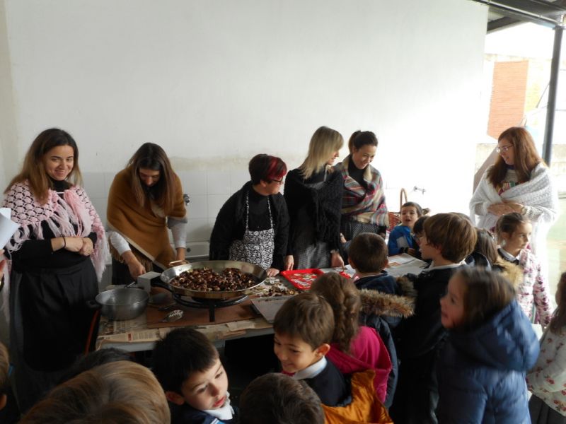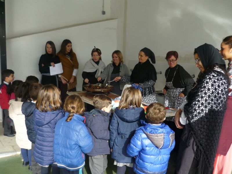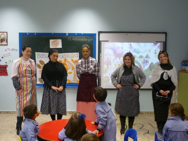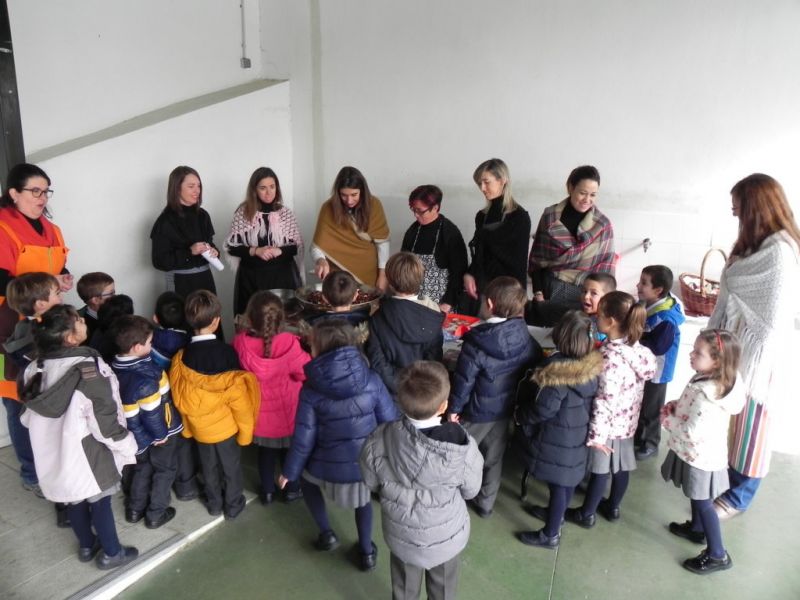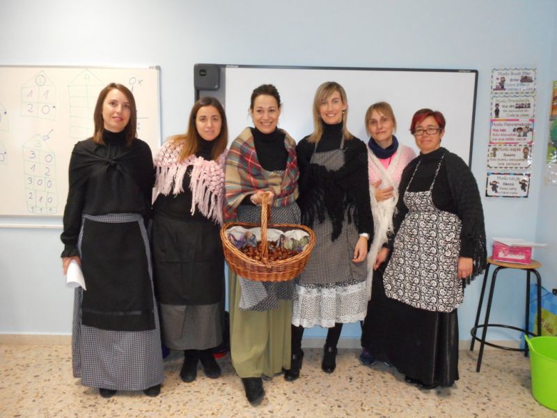 Esta mañana otoñal la hemos dedicado a la fiesta de las castañas, este fruto tan bueno que recogemos en esta época del año. Nuestras mamás y un papá de educación infantil estaban guapísimas ataviadas con sus faldas largas, chales, pañuelos y delantales, irradiaban felicidad al ver cómo sus pequeños, en las clases, les entregaban las castañas para asarlas.