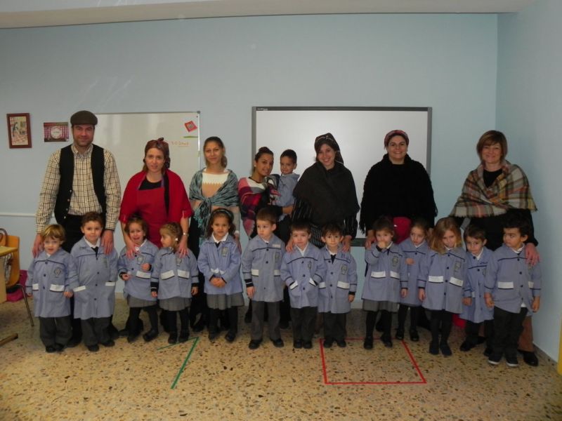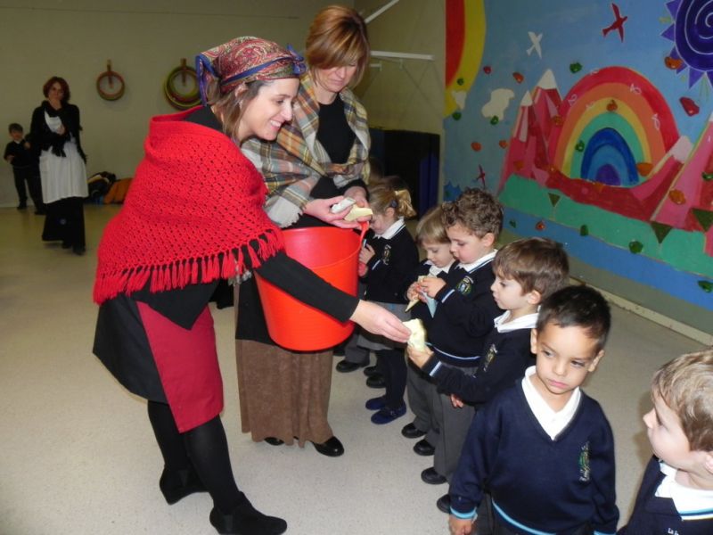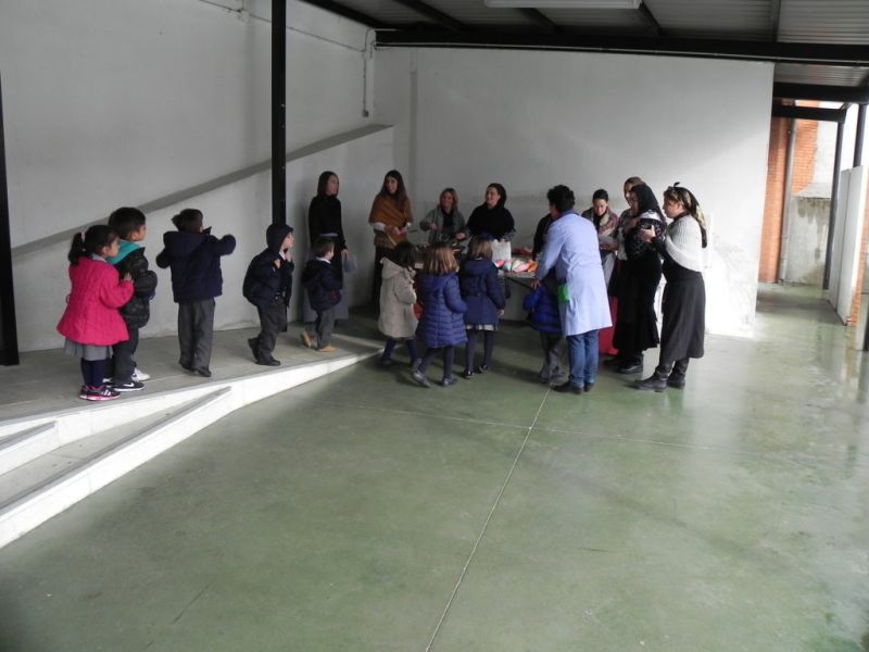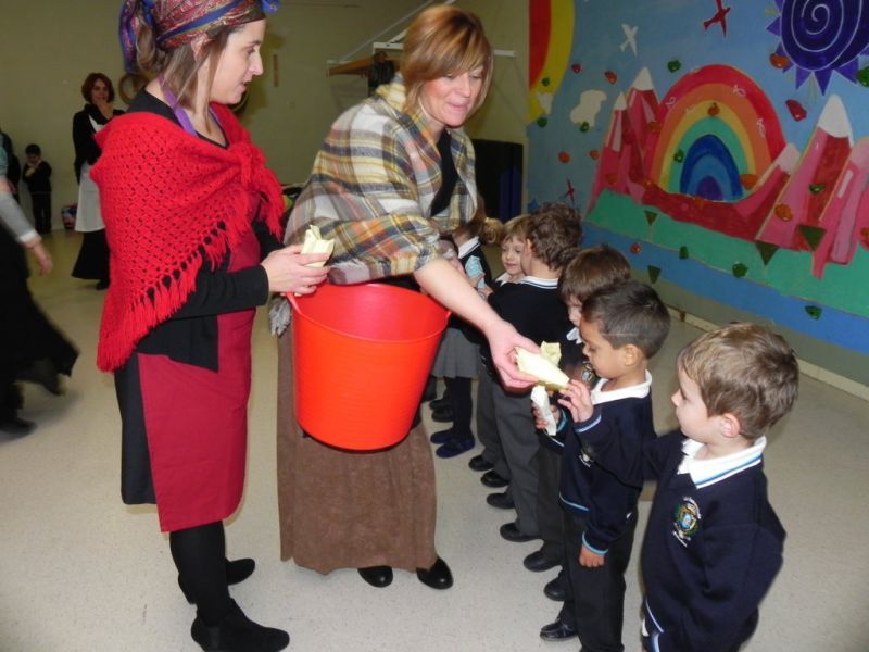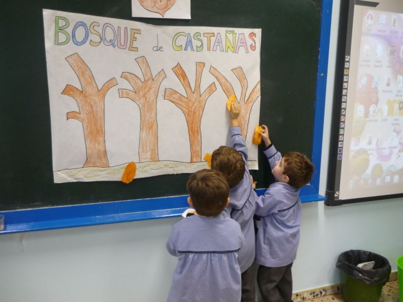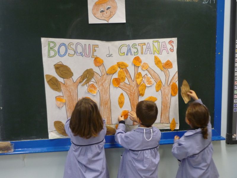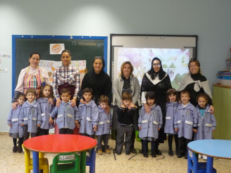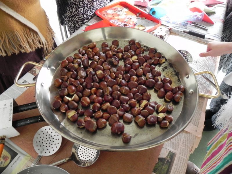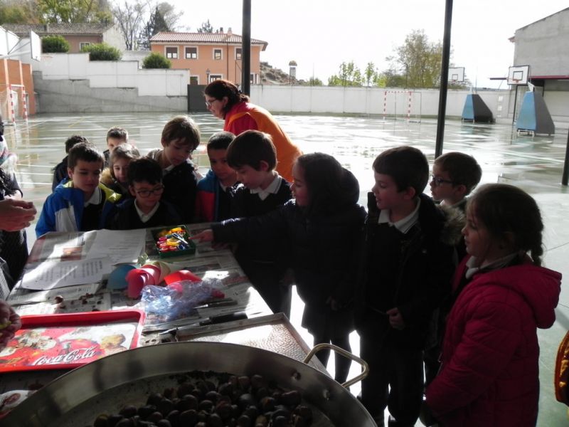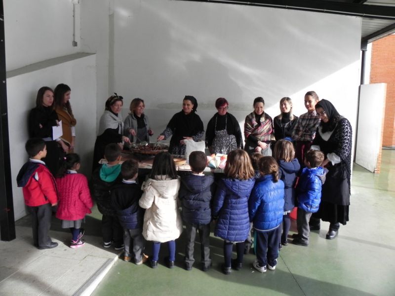 Esta mañana otoñal la hemos dedicado a la fiesta de las castañas, este fruto tan bueno que recogemos en esta época del año. Nuestras mamás y un papá de educación infantil estaban guapísimas ataviadas con sus faldas largas, chales, pañuelos y delantales, irradiaban felicidad al ver cómo sus pequeños, en las clases, les entregaban las castañas para asarlas.