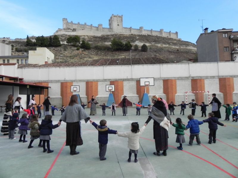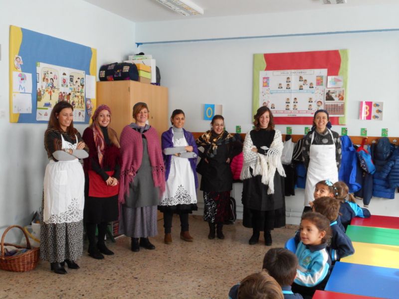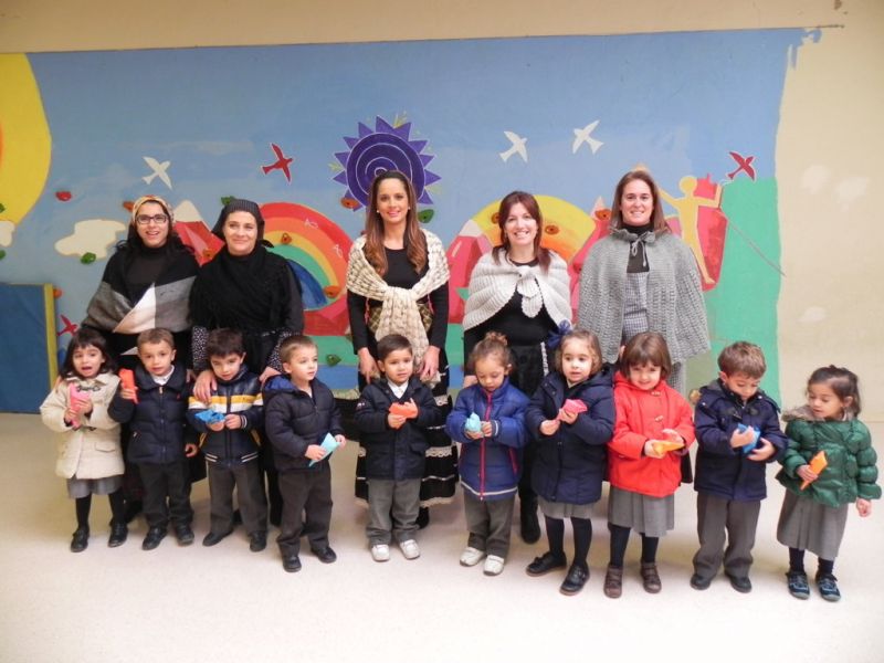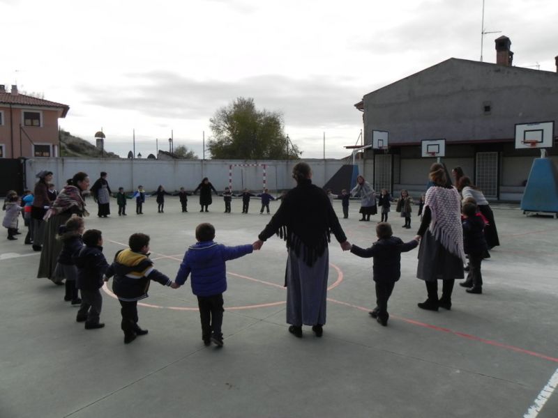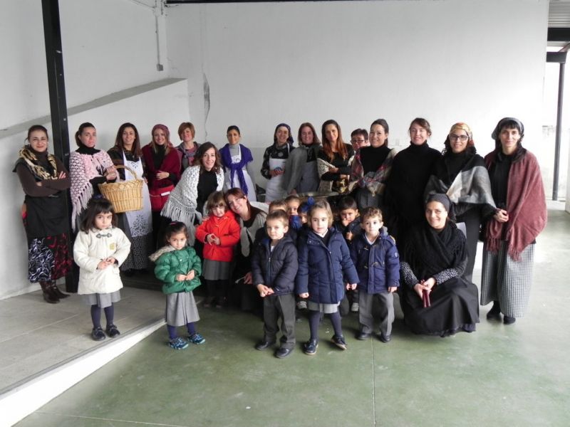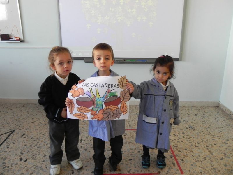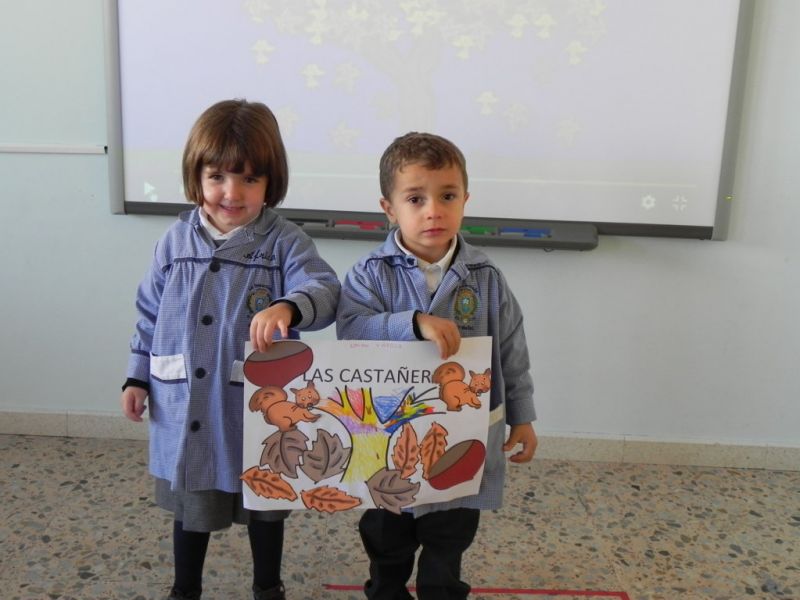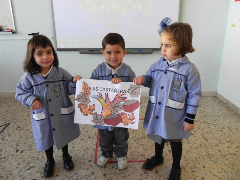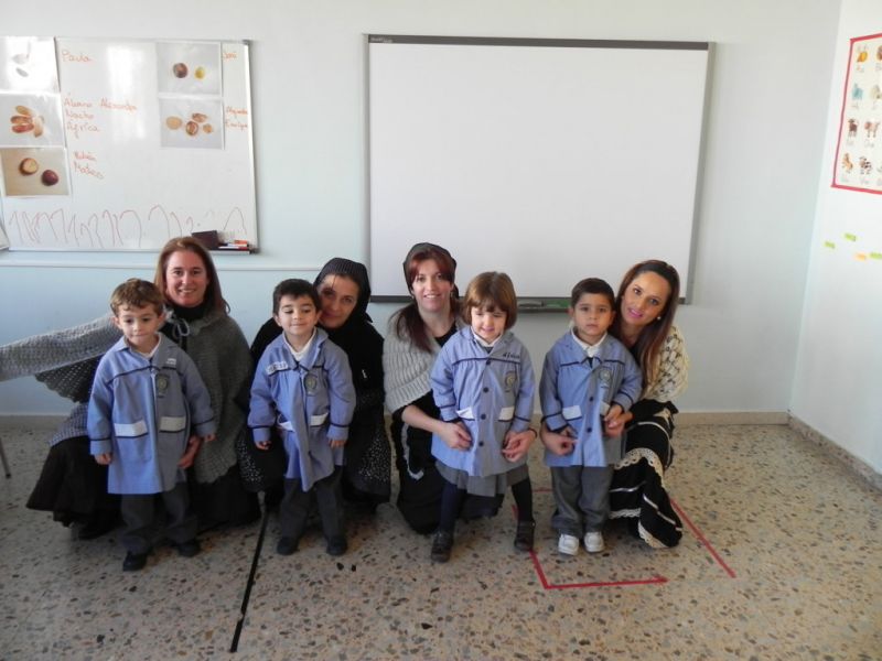Esta mañana otoñal la hemos dedicado a la fiesta de las castañas, este fruto tan bueno que recogemos en esta época del año. Nuestras mamás de educación infantil estaban guapísimas ataviadas con sus faldas largas, chales, pañuelos y delantales, irradiaban felicidad al ver cómo sus pequeños, en las clases, les entregaban las castañas para asarlas.