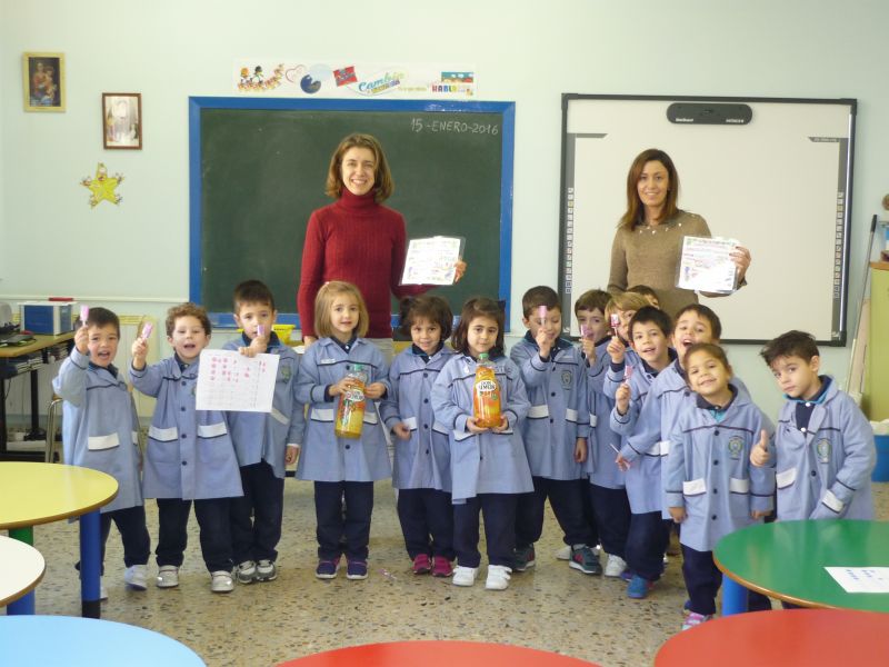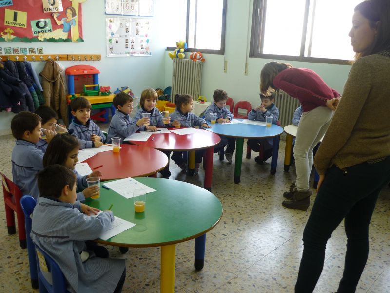 Los alumnos de 2º de Infantil han realizado un taller de «cata a ciegas» dirigido por algunas mamás entendidas en el tema. Ha consistido en que a través del sentido de la vista, olfato y gusto, tenían que descubrir de qué tipo de zumo de fruta se trataba. Después los niños trasladaban sus impresiones a una tabla de doble entrada y por último las «expertas» les enseñaban el envase del zumo misterioso para contrastar los resultados. La verdad es que la experiencia ha sido muy positiva porque los niños han estado como auténticos sumilleres, han aprendido que mediante los sentidos somos capaces de percibir muchas cosas que a simple vista no se ven.