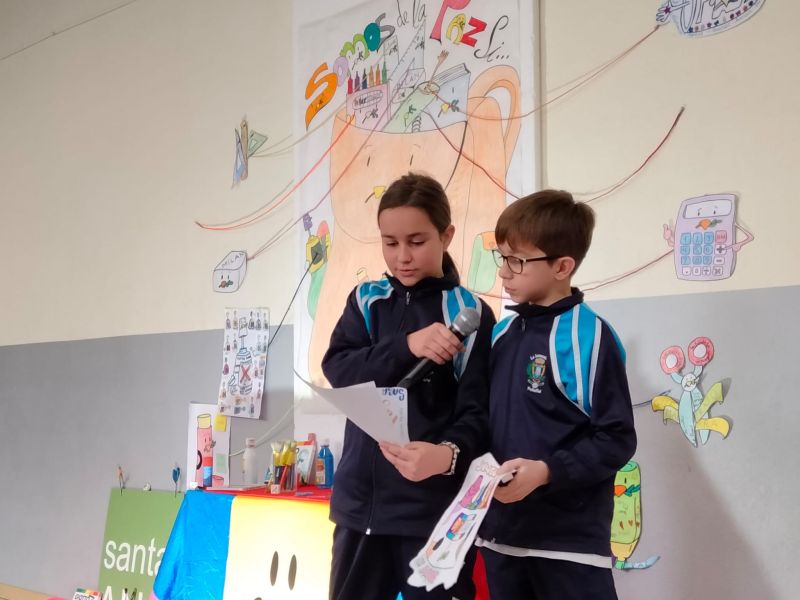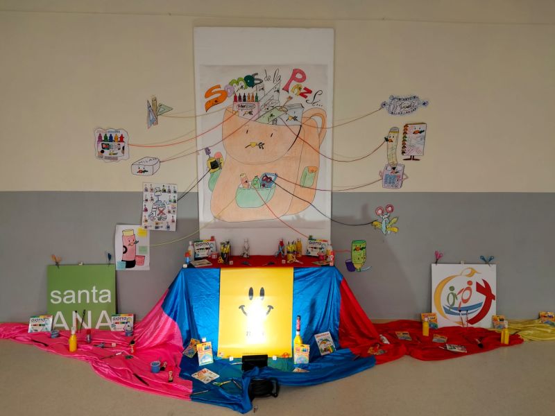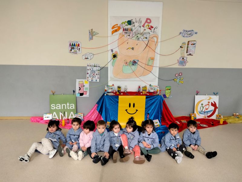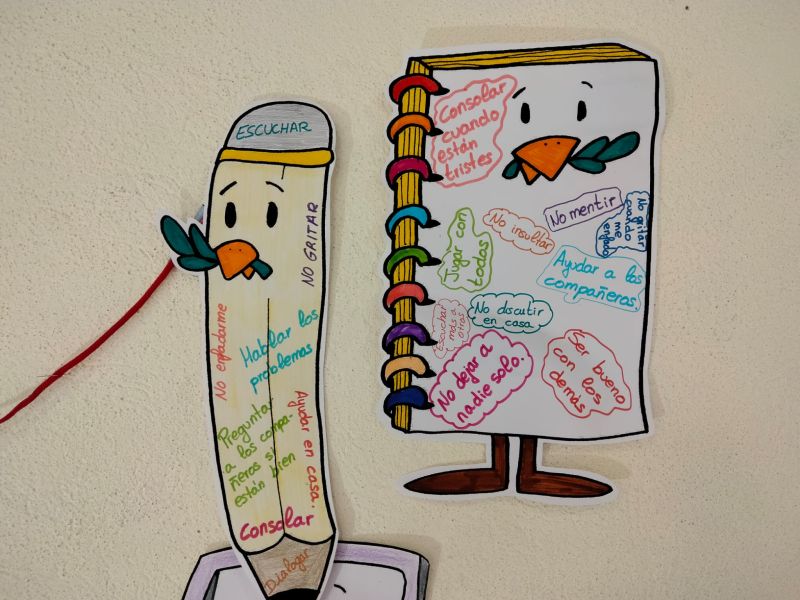 Hemos utilizado la goma para borrar malos gestos, el pegamento para unir amistades, el subrayador para resaltar nuestras mejores actitudes, la calculadora para multiplicar besos y abrazos, el estuche para acoger a todos como una gran familia, el corrector para no tachar a nadie, las tijeras para cortar con insultos, las reglas para recordar las normas de convivencia, las pinturas de colores para aceptar la diversidad, y el cuaderno y el lápiz para poder escribir bonitos mensajes de Paz.