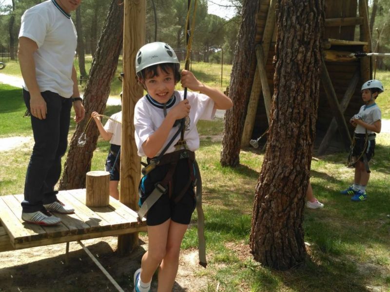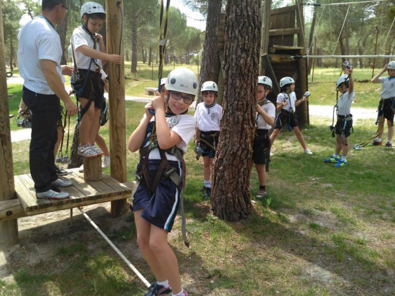 Los alumnos de 3º y 4º emprenden hoy su excursión de final de curso con sus compañeros y profesores al Parque de Aventuras «El Trasto» en Hornillos de Eresma. Allí, acompañados por monitores están realizando un circuito multiaventura con tirolinas, juegos tradicionales, rocódromos, tiro al arco, yincanas …