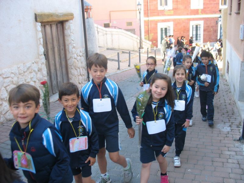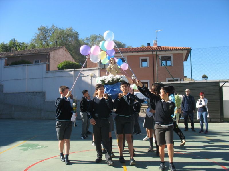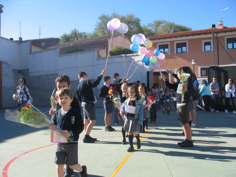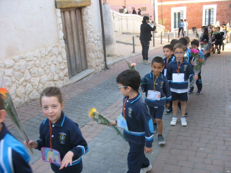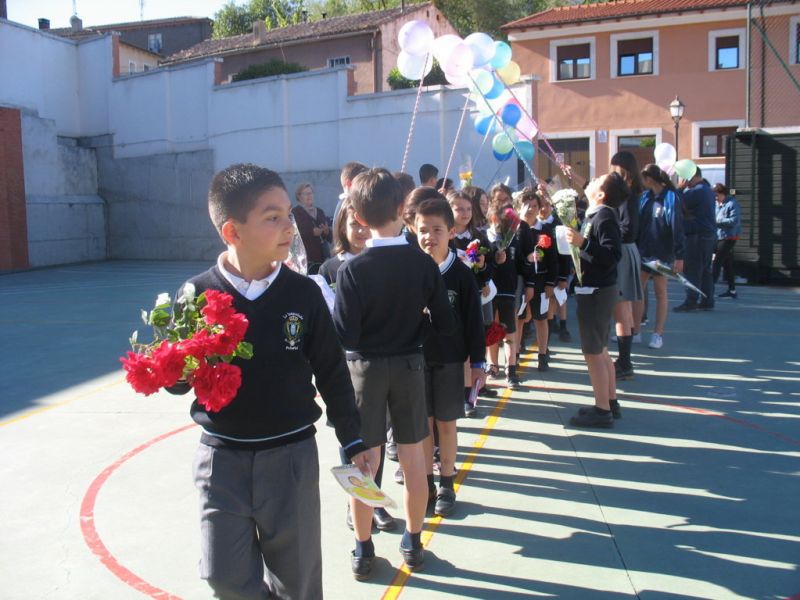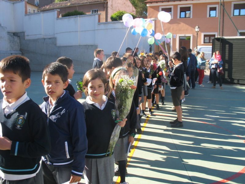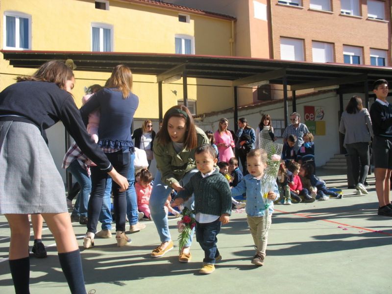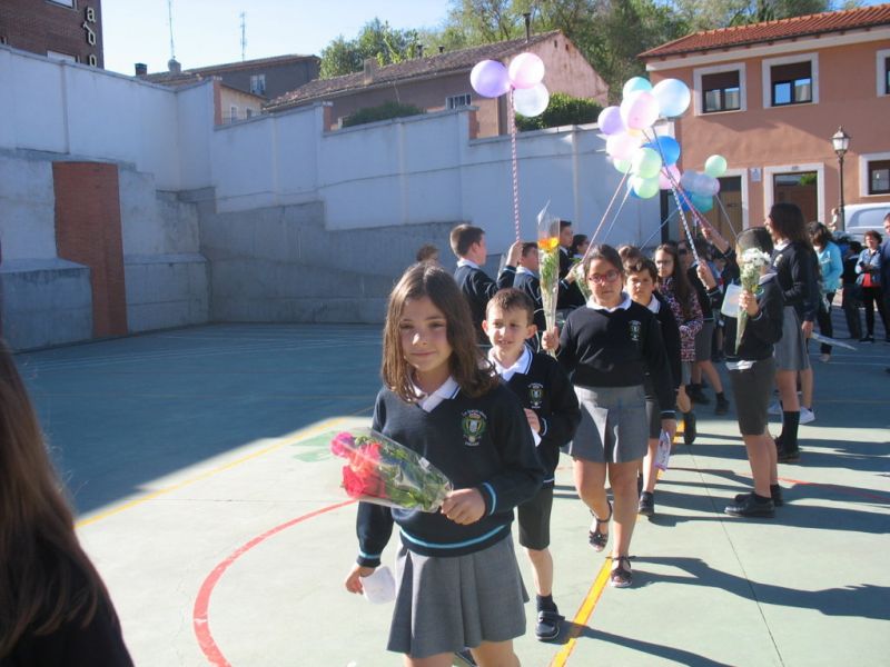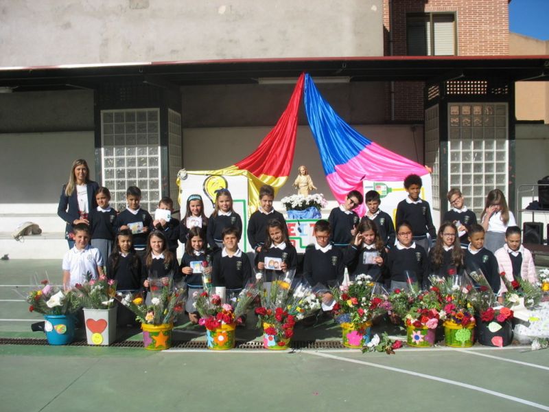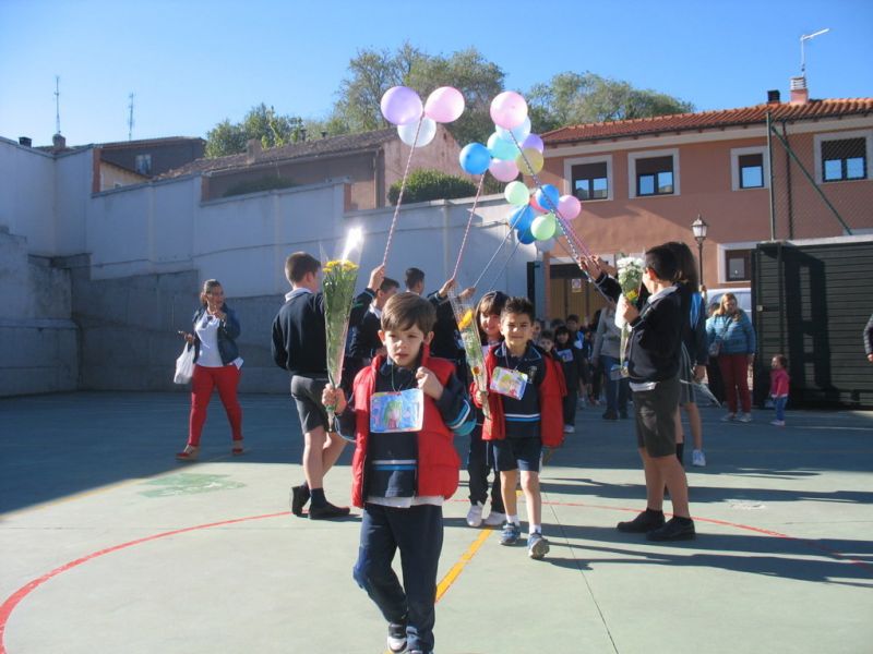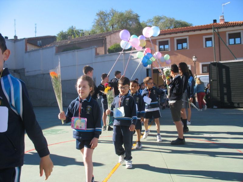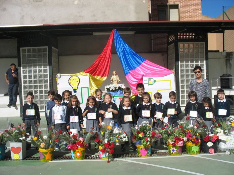 Hoy  todos estaban preparados con sus flores y sus mensajes para comenzar la procesión con la Virgen Niña por las calles anexas al cole. Una vez en el patio,  cada uno ofreció su flor a María a la vez que enseñaba su mensaje como símbolo de amor hacia ella.