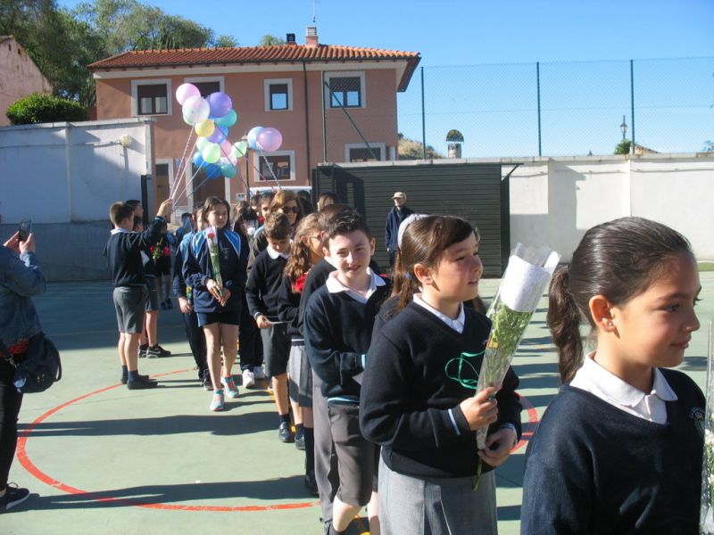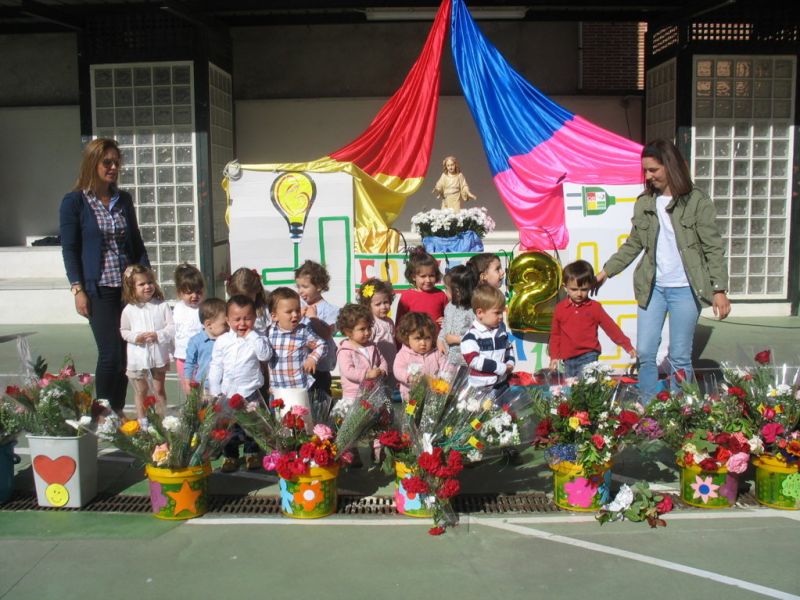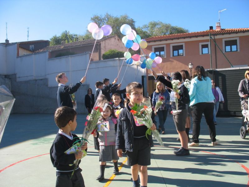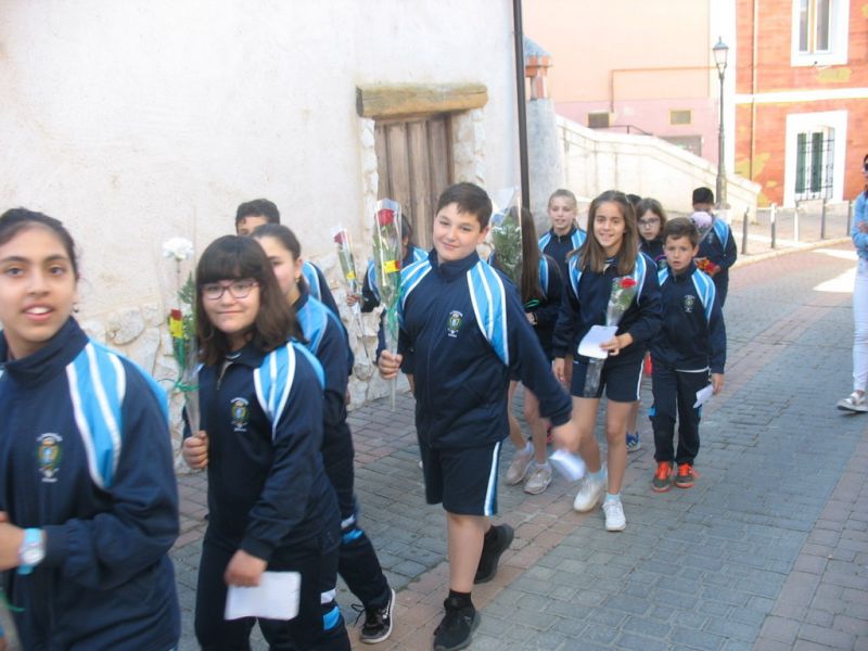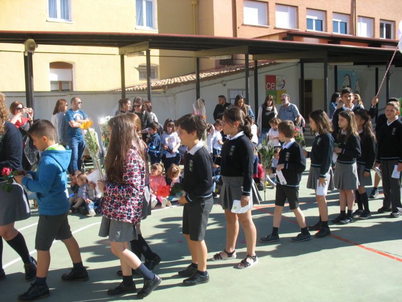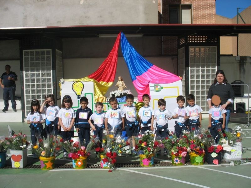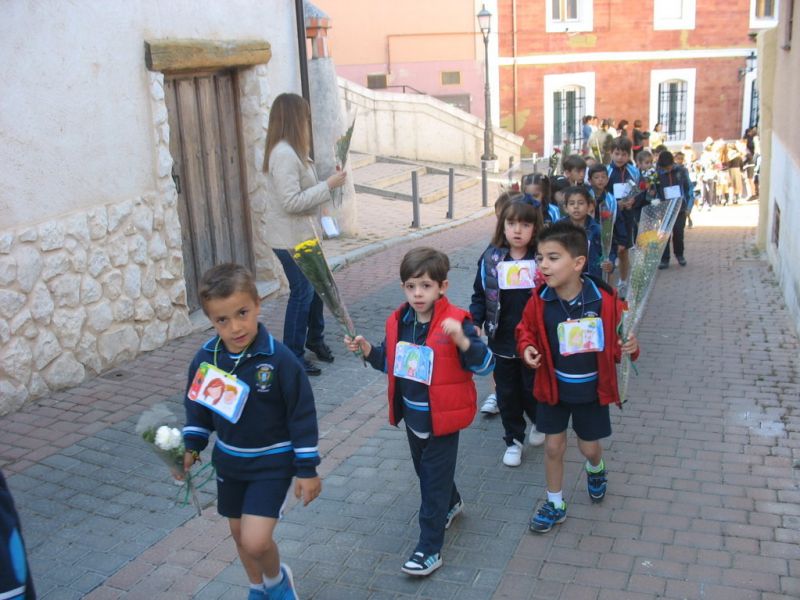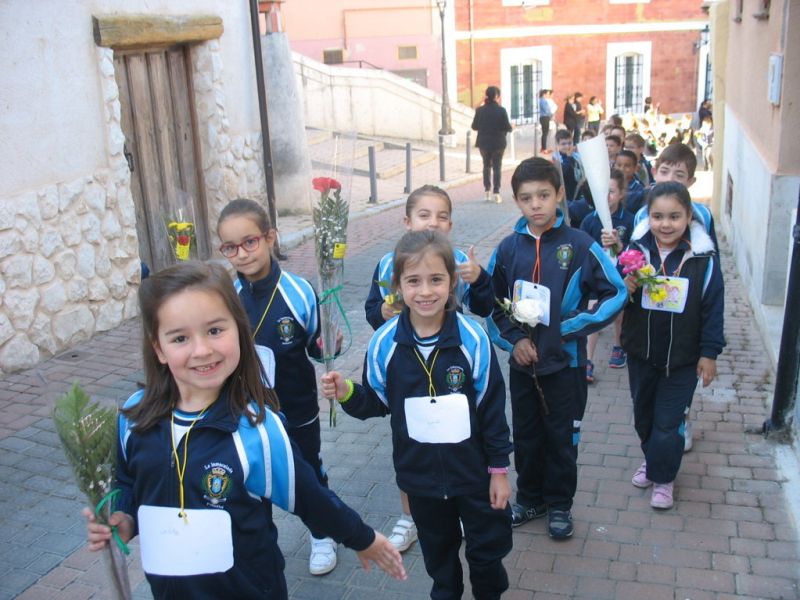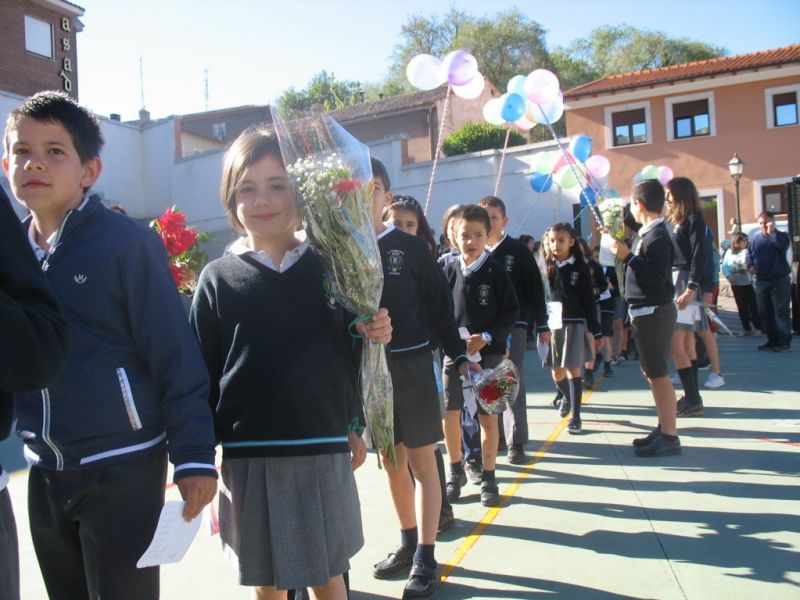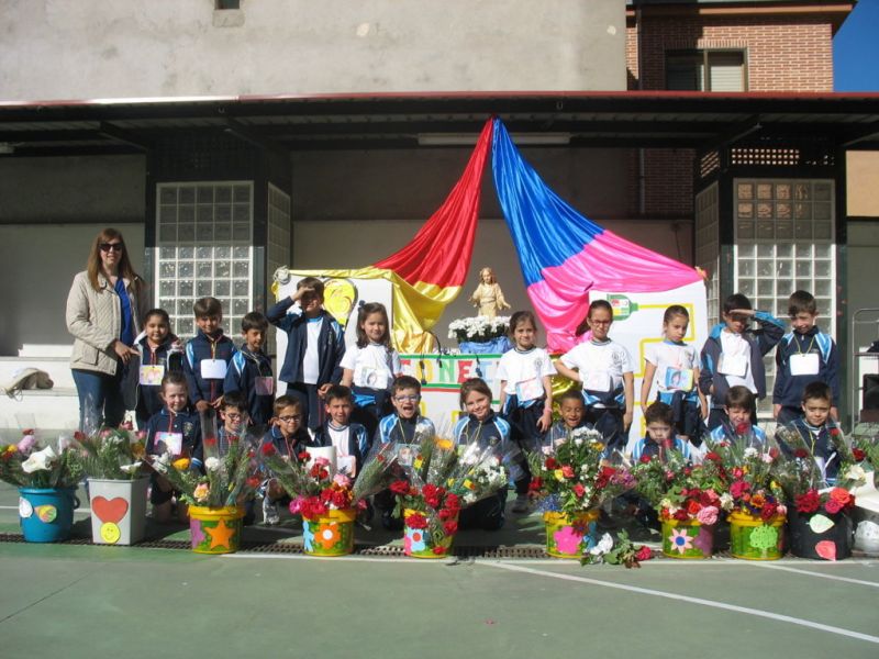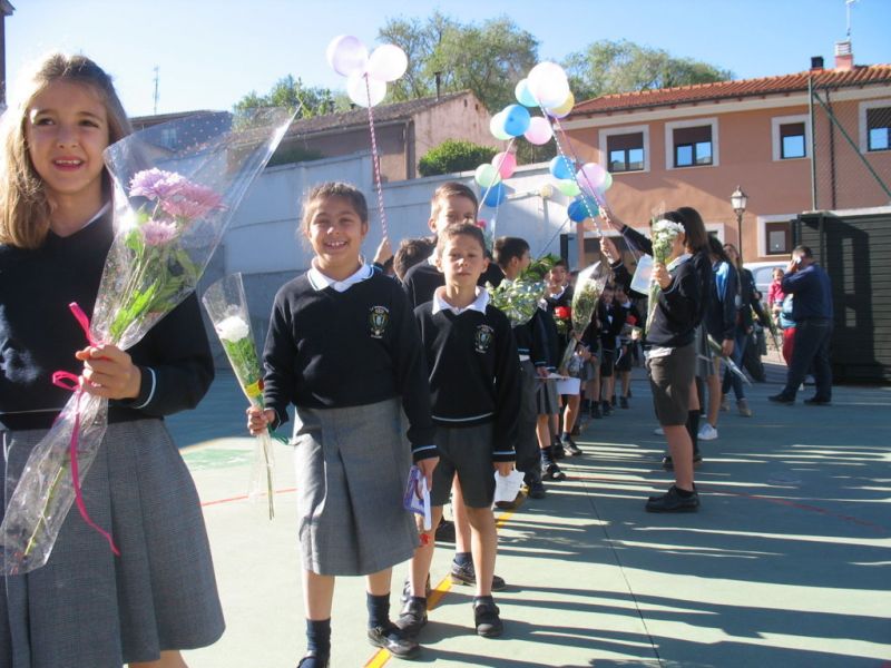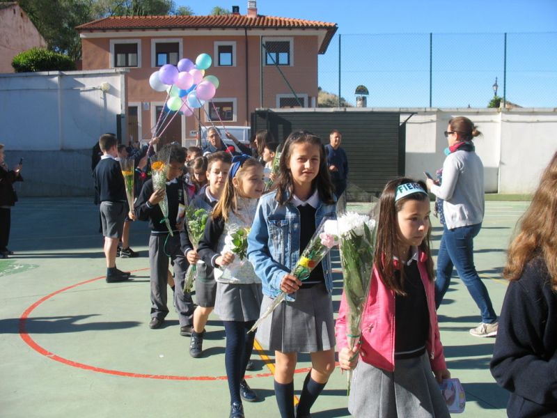 Hoy  todos estaban preparados con sus flores y sus mensajes para comenzar la procesión con la Virgen Niña por las calles anexas al cole. Una vez en el patio,  cada uno ofreció su flor a María a la vez que enseñaba su mensaje como símbolo de amor hacia ella.