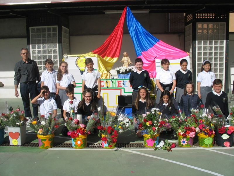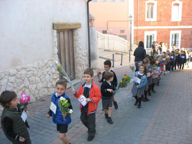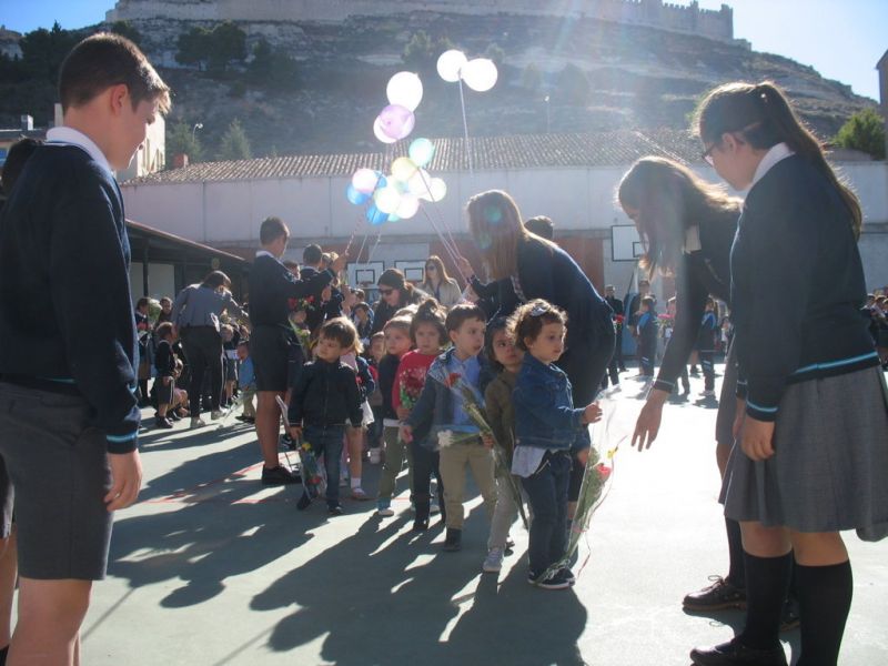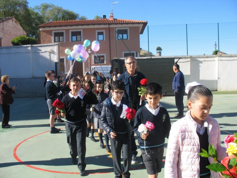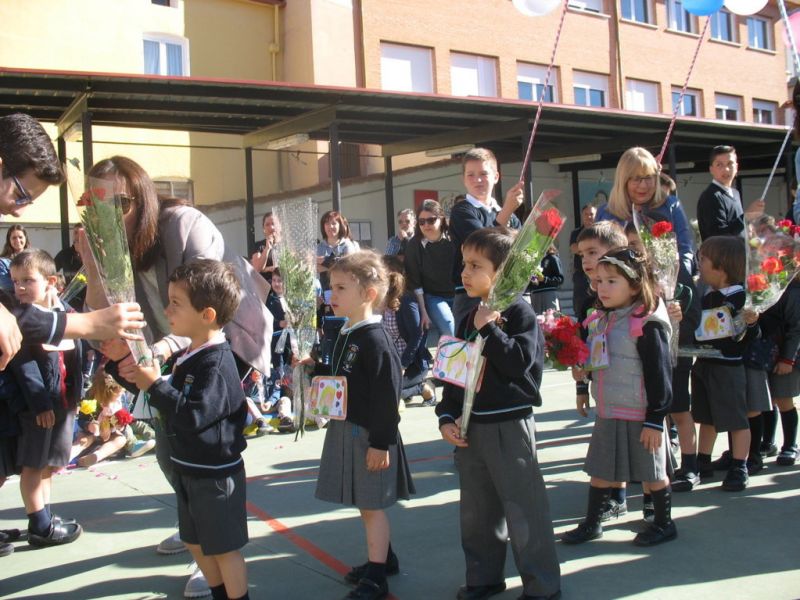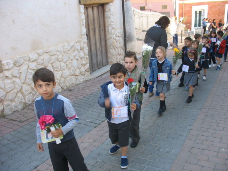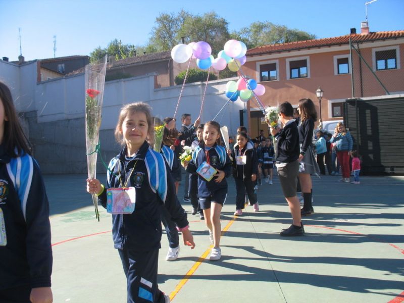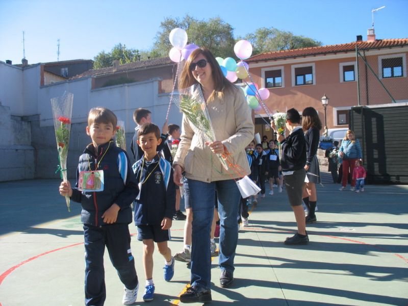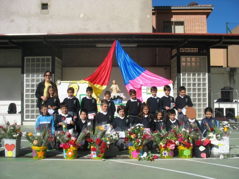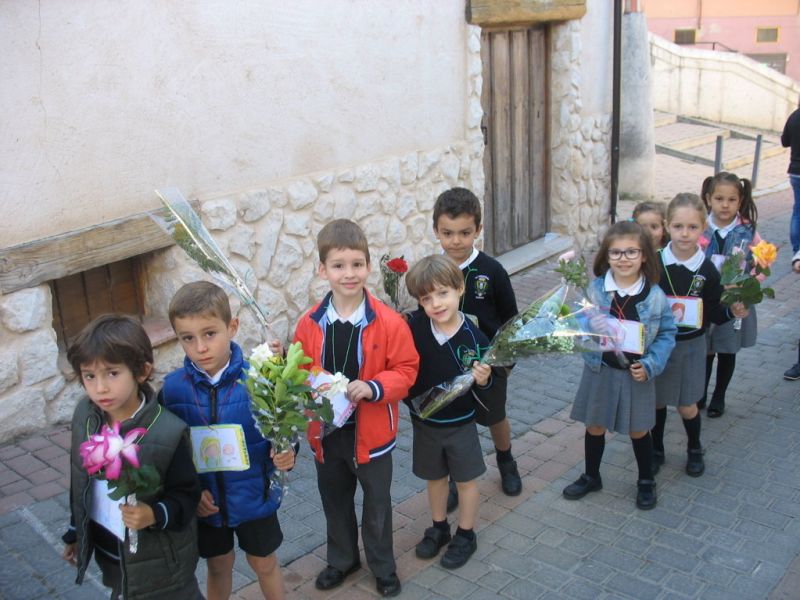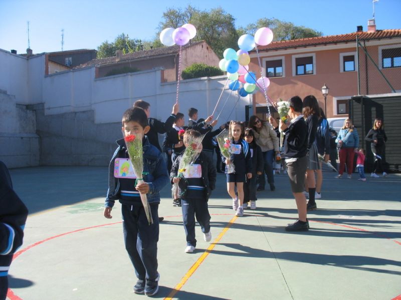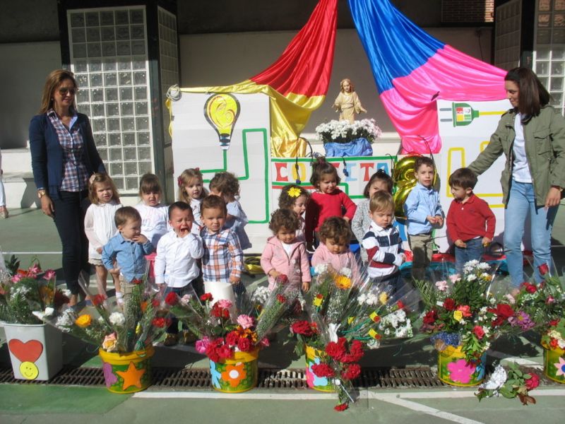 Hoy  todos estaban preparados con sus flores y sus mensajes para comenzar la procesión con la Virgen Niña por las calles anexas al cole. Una vez en el patio,  cada uno ofreció su flor a María a la vez que enseñaba su mensaje como símbolo de amor hacia ella.
