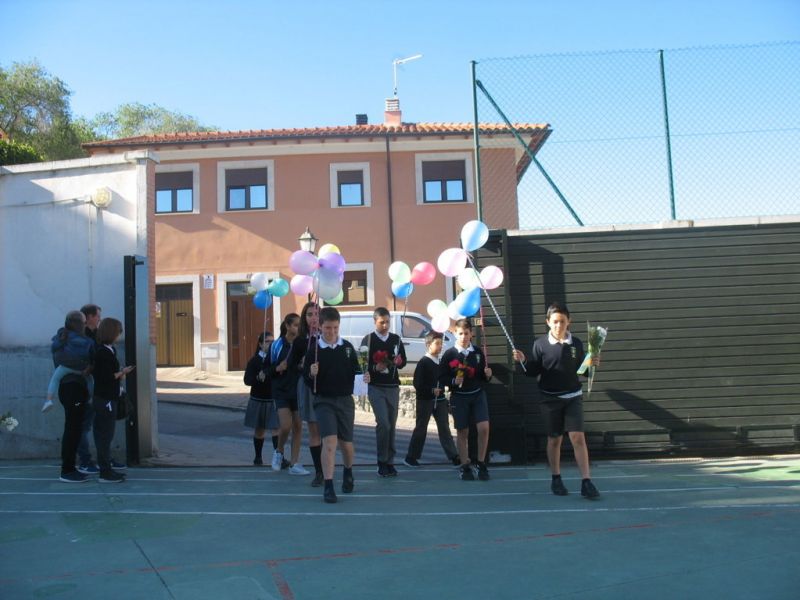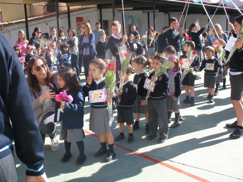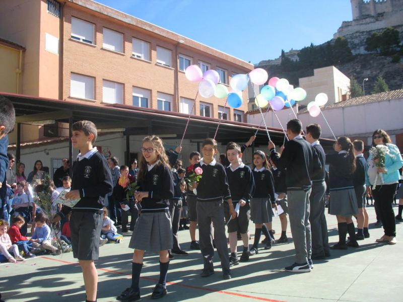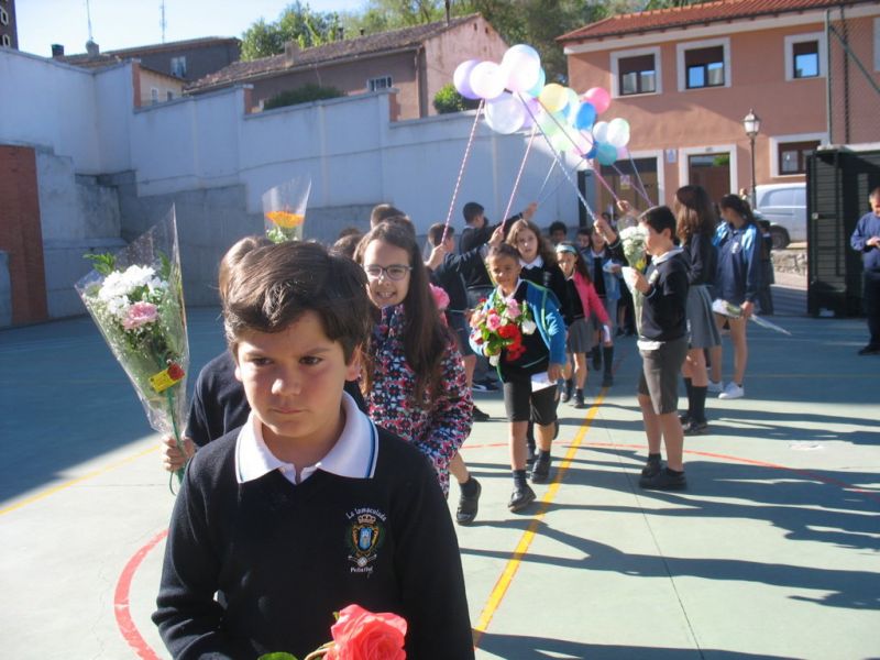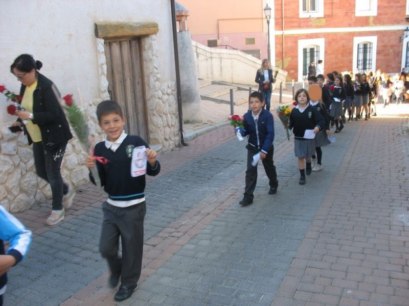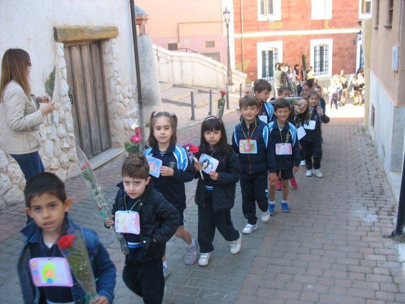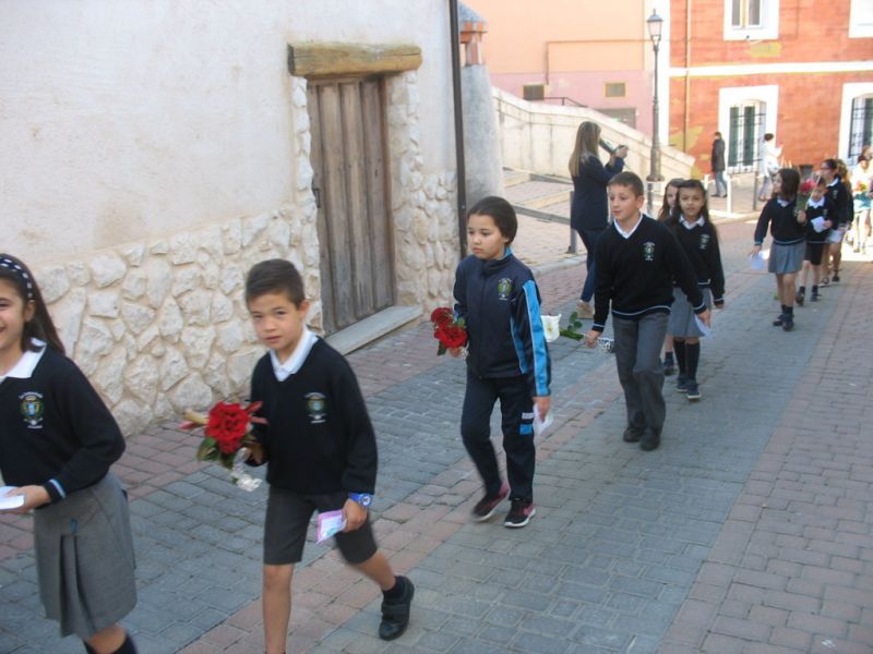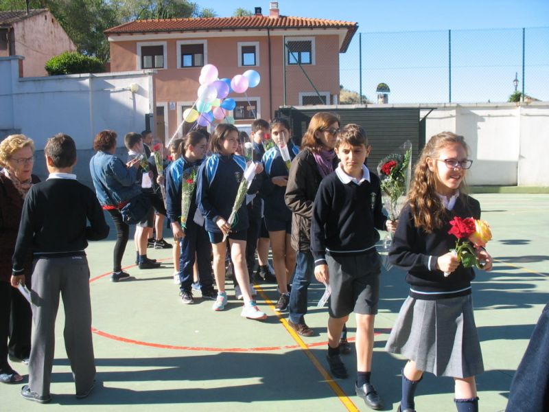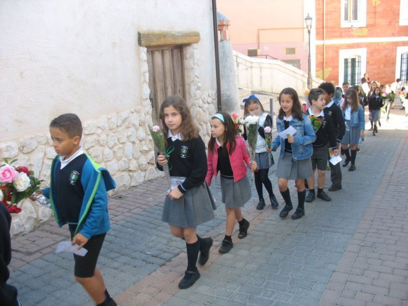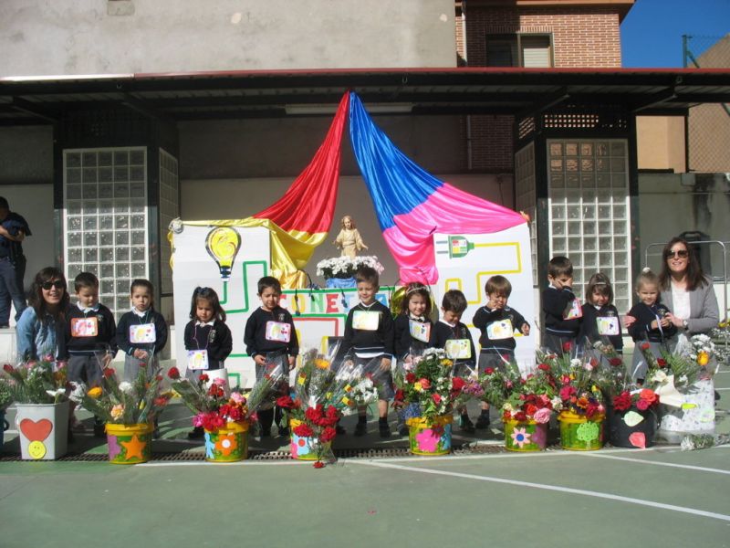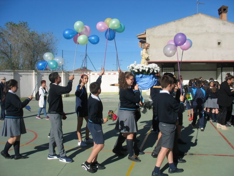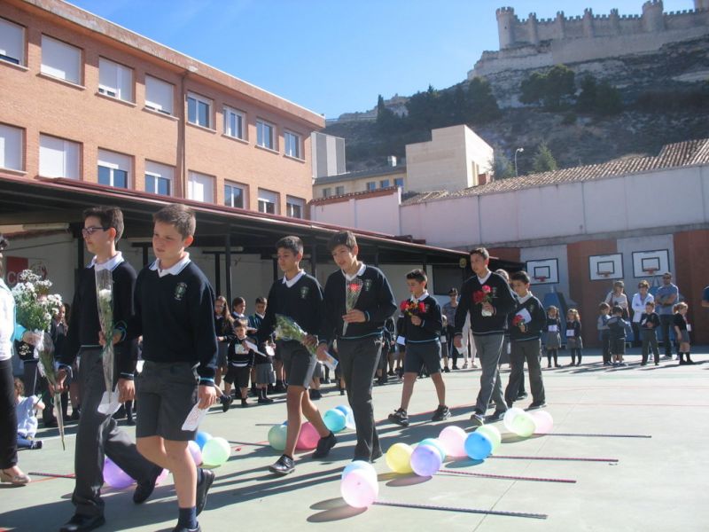 Hoy  todos estaban preparados con sus flores y sus mensajes para comenzar la procesión con la Virgen Niña por las calles anexas al cole. Una vez en el patio,  cada uno ofreció su flor a María a la vez que enseñaba su mensaje como símbolo de amor hacia ella.