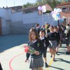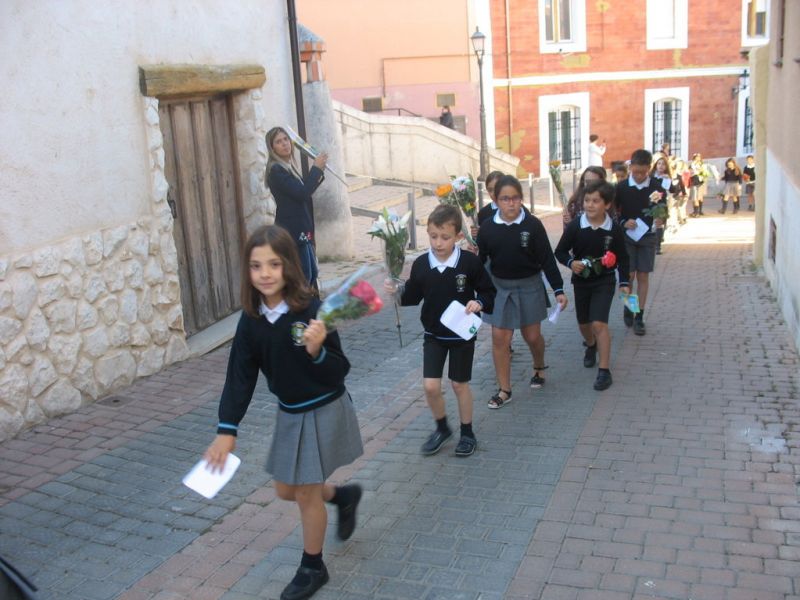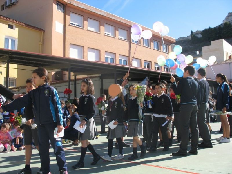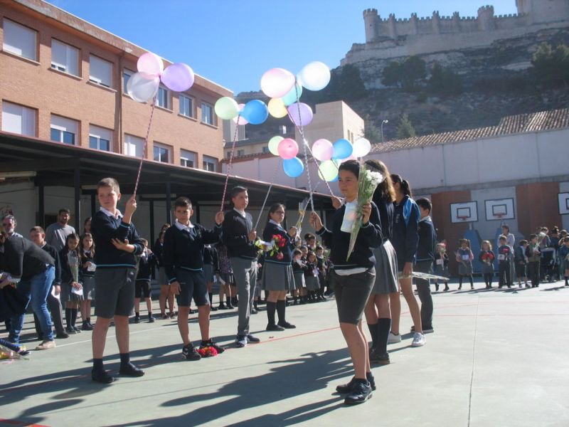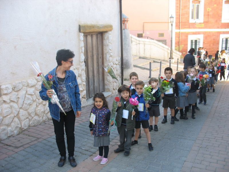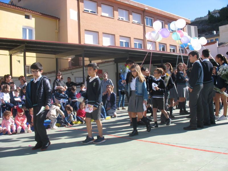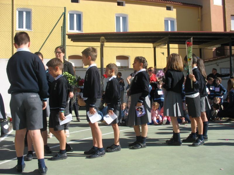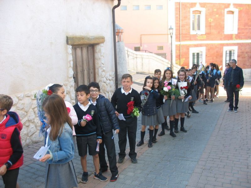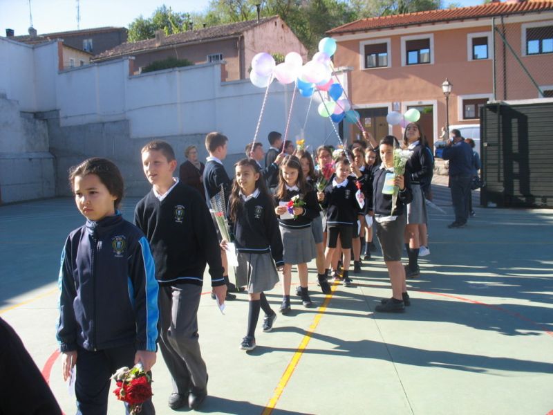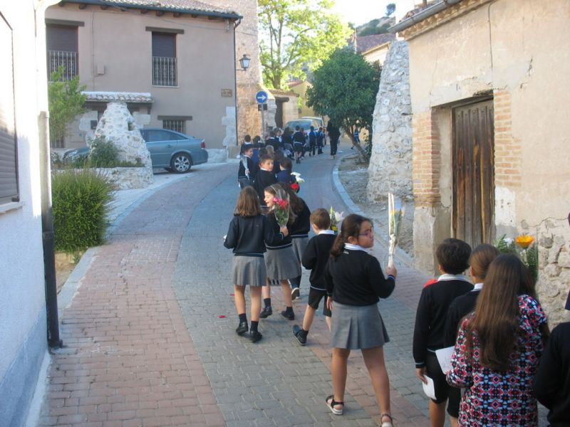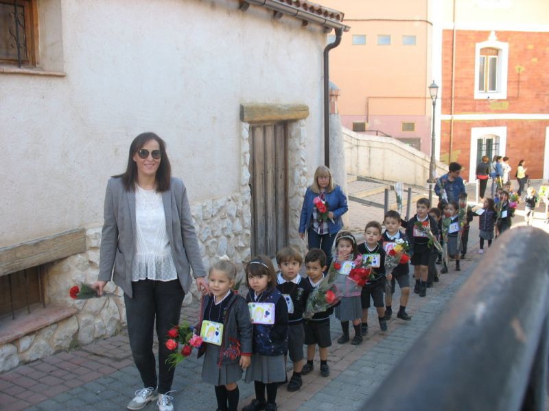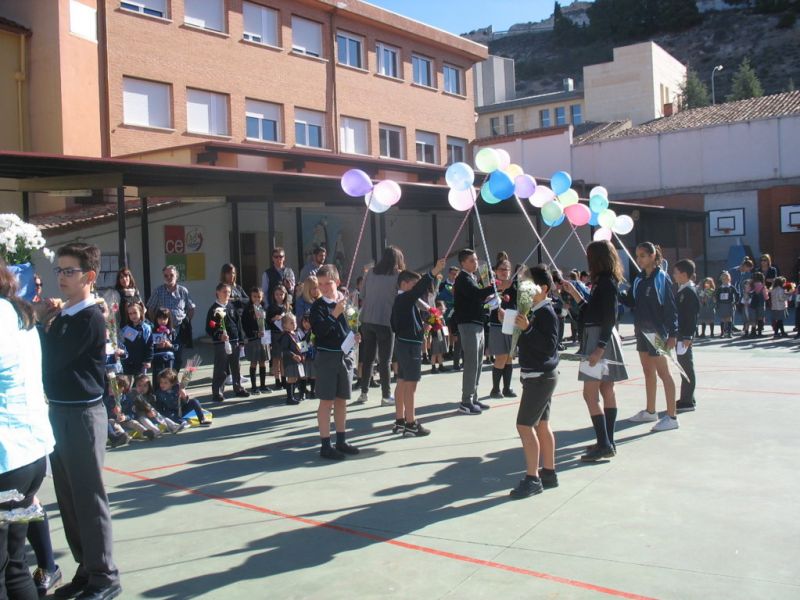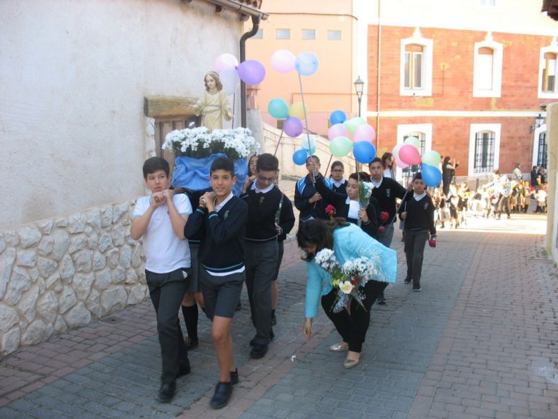 Hoy  todos estaban preparados con sus flores y sus mensajes para comenzar la procesión con la Virgen Niña por las calles anexas al cole. Una vez en el patio,  cada uno ofreció su flor a María a la vez que enseñaba su mensaje como símbolo de amor hacia ella.