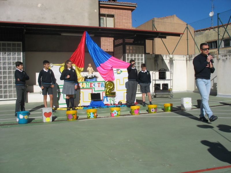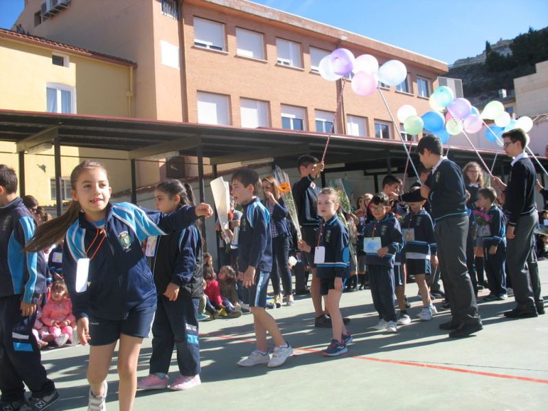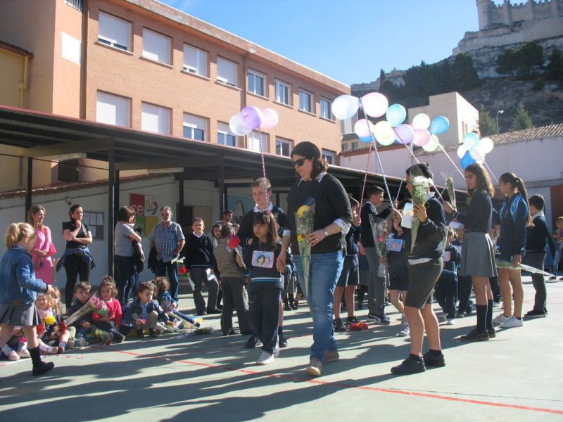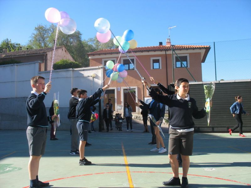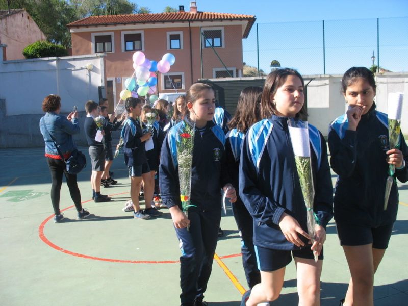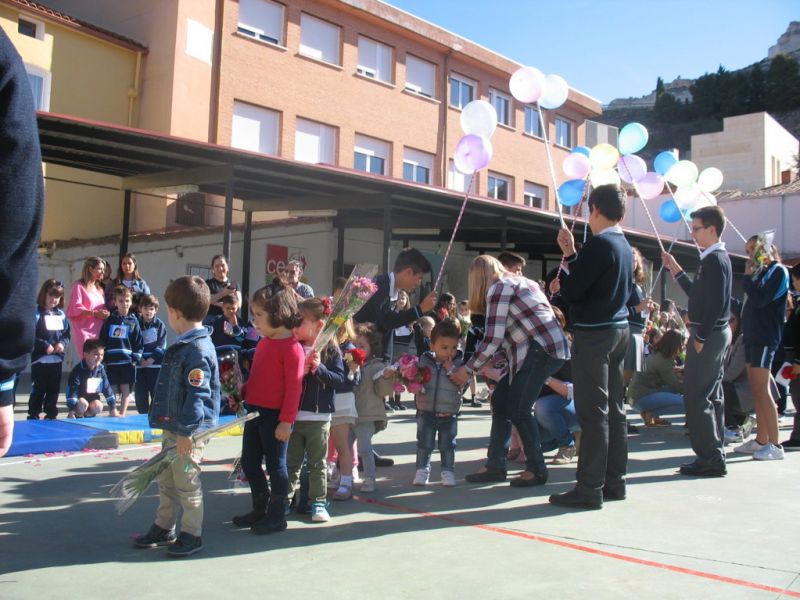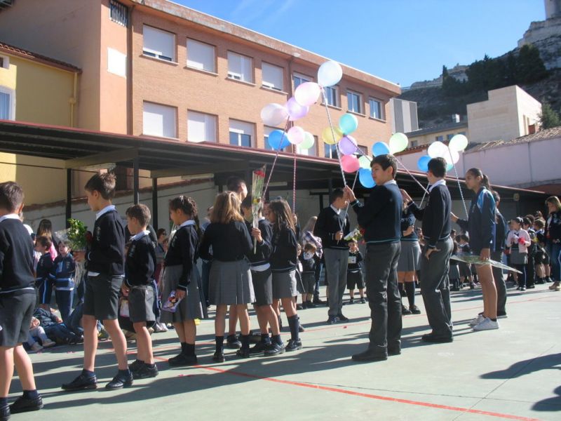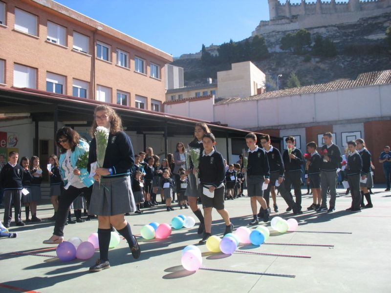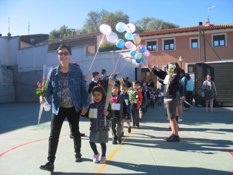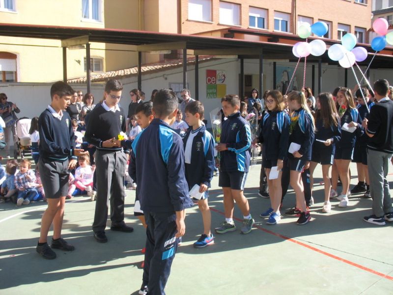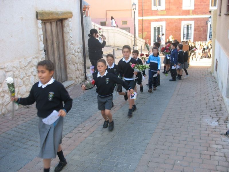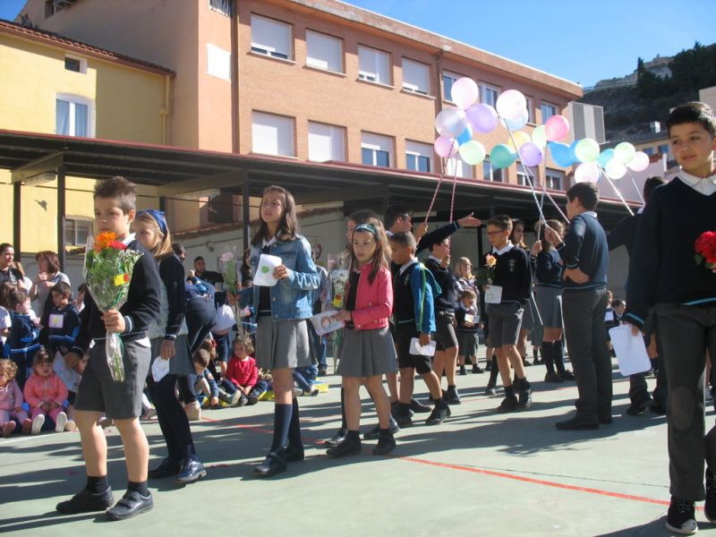 Hoy  todos estaban preparados con sus flores y sus mensajes para comenzar la procesión con la Virgen Niña por las calles anexas al cole. Una vez en el patio,  cada uno ofreció su flor a María a la vez que enseñaba su mensaje como símbolo de amor hacia ella.