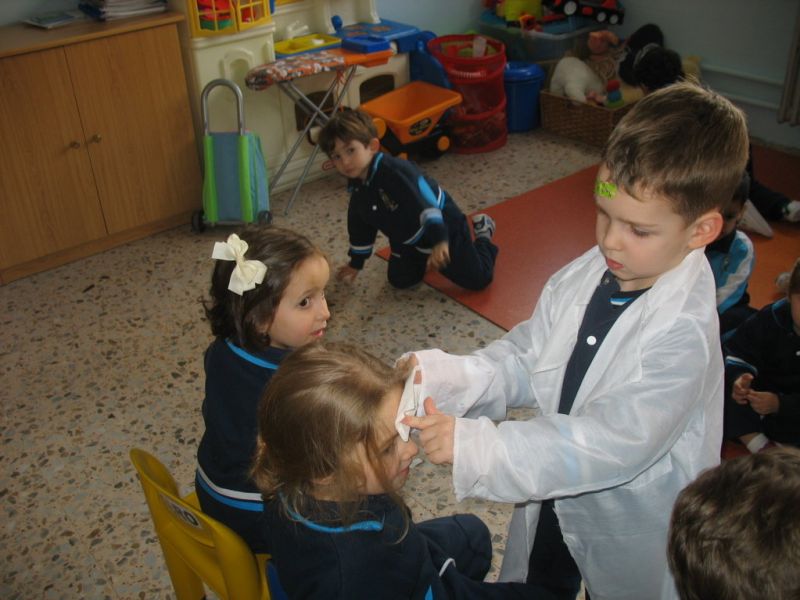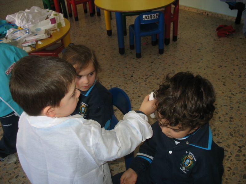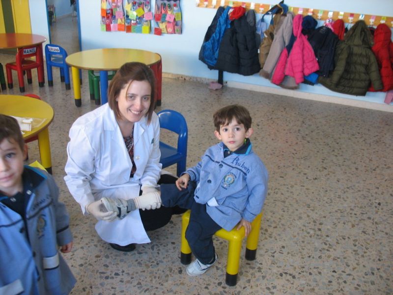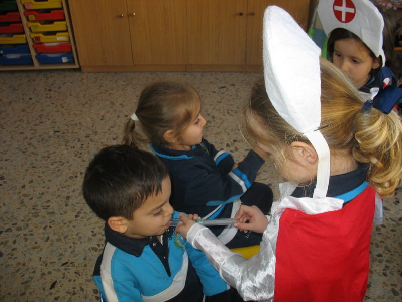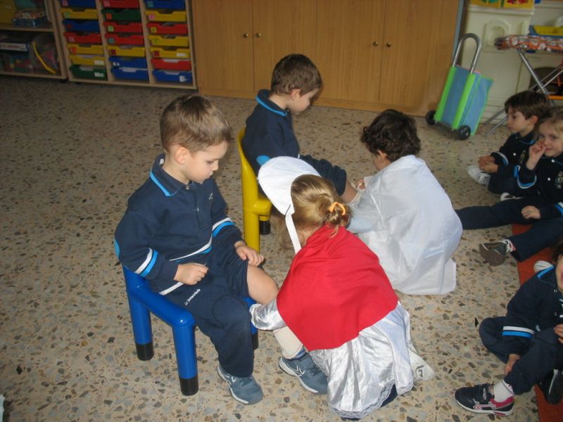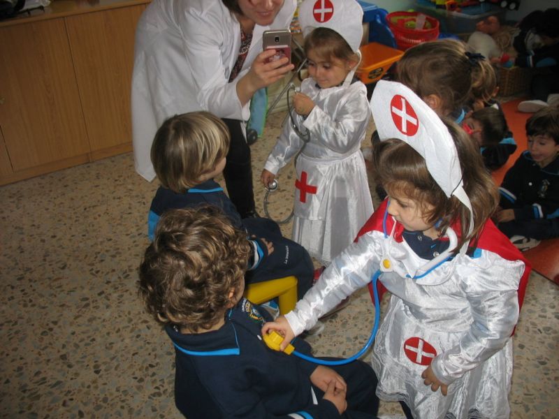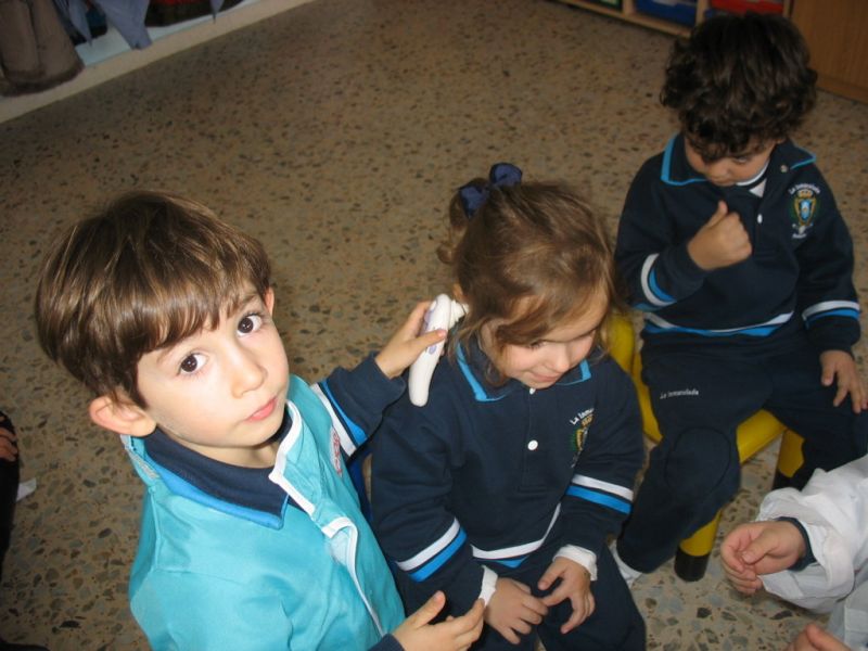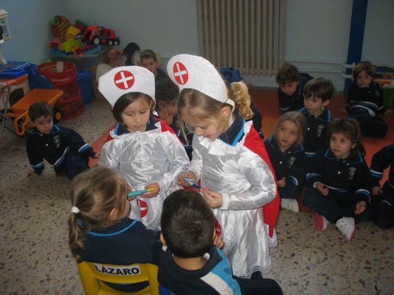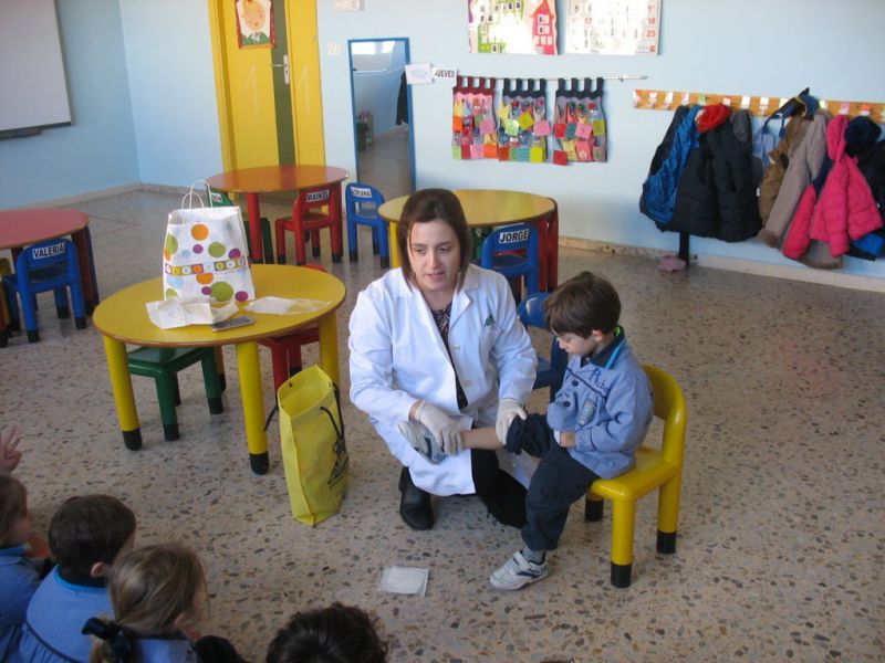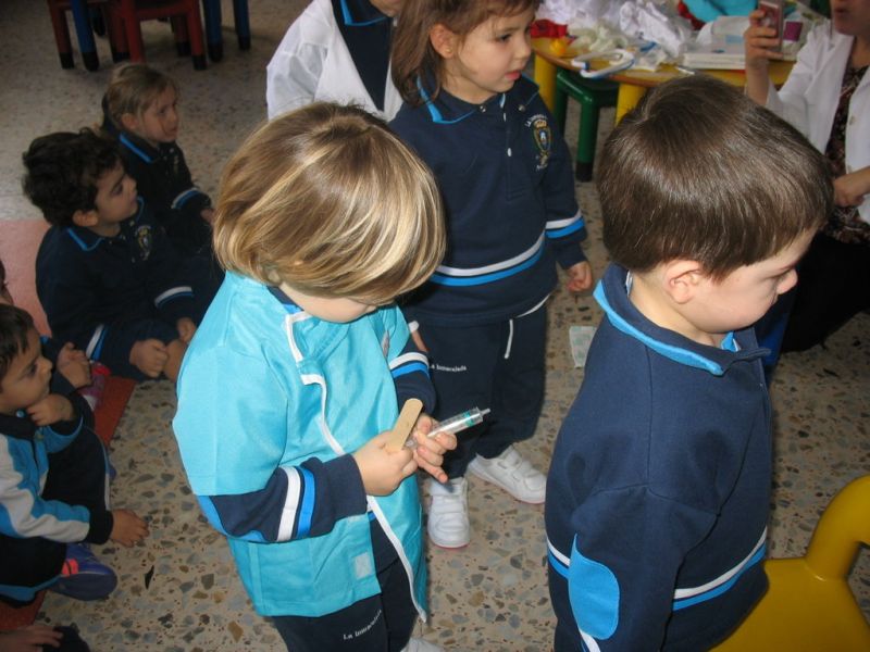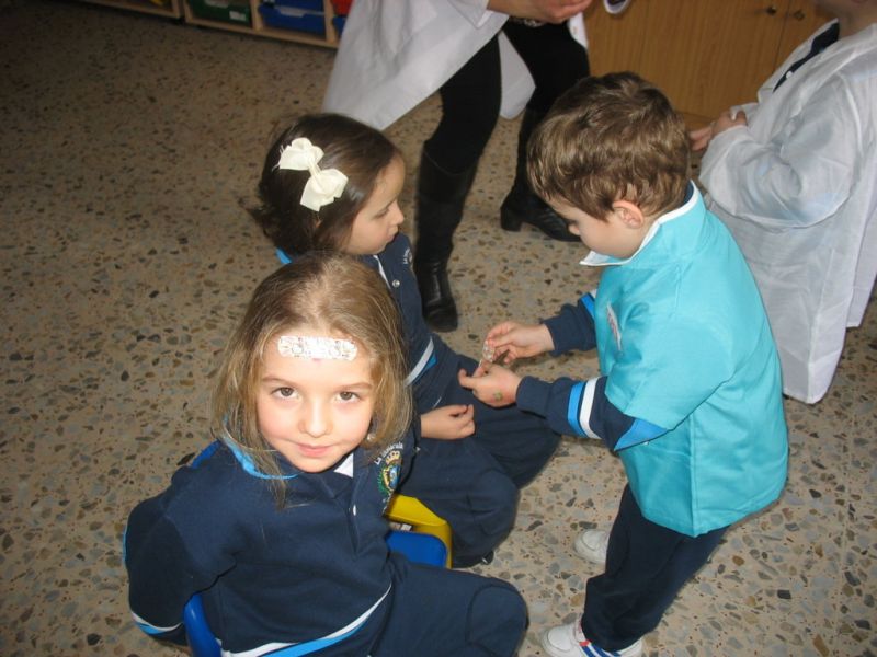 Ayer. los alumnos de 1º de infantil tuvieron una visita muy especial. Una profesional de la enfermería vino a contarnos muchas cosas de cuando nos ponemos malitos o nos hacemos alguna herida. Nos enseñó vendas, termómetros, tiritas, esparadrapos, palitos, etc. Nuestra clase se convirtió en una auténtica enfermería y con su ayuda ya tenemos menos miedo cuando nos hacen una cura o nos ponen una vacuna. Todos querían ser enfermeras y doctores.