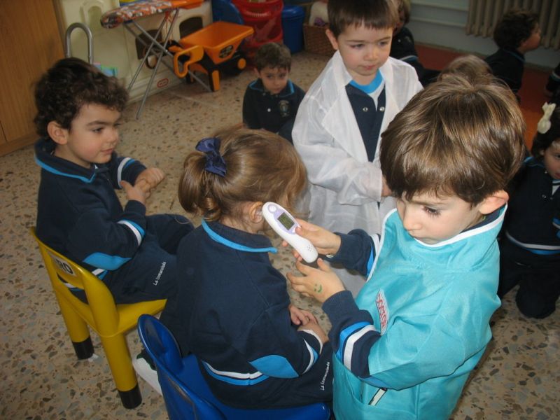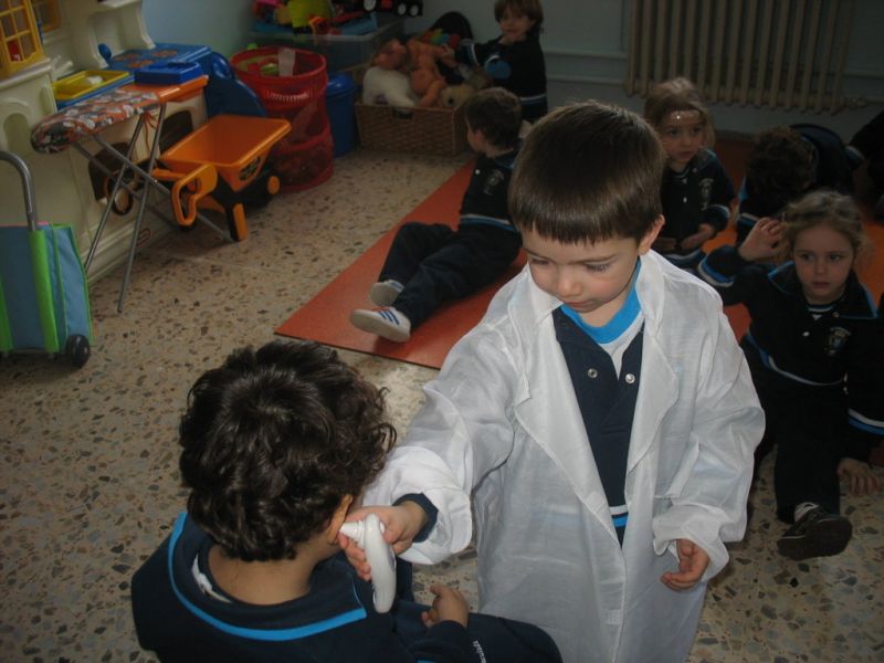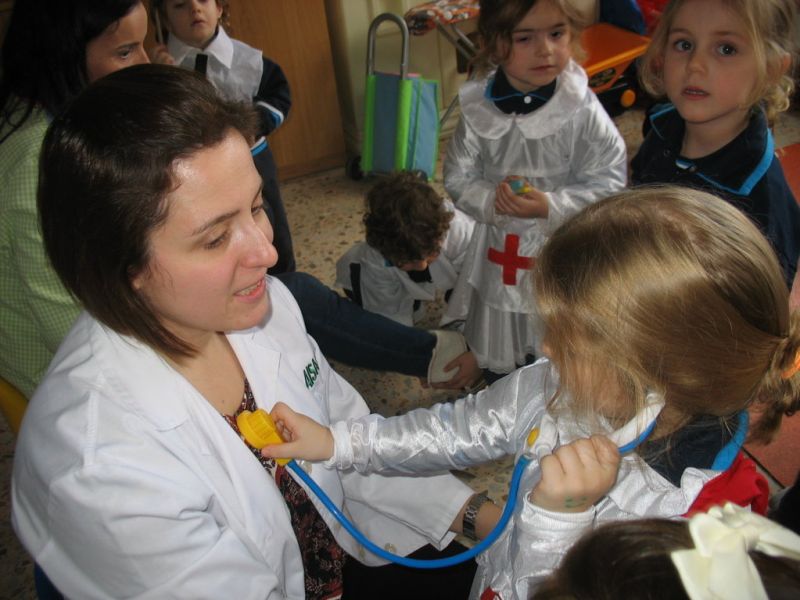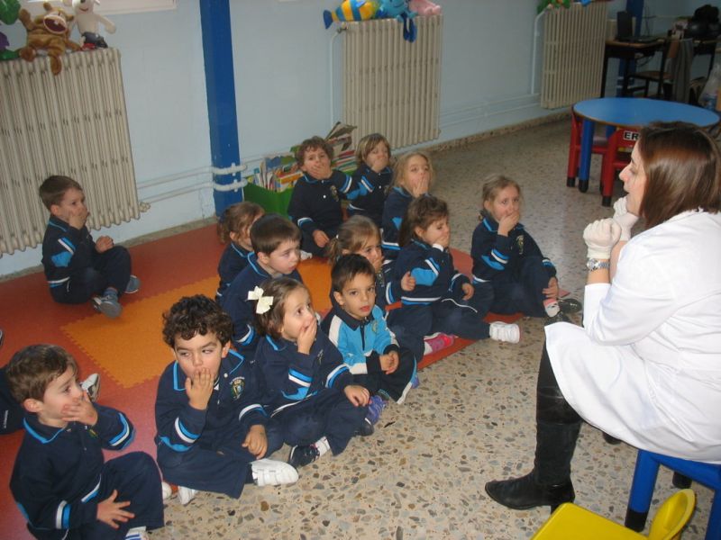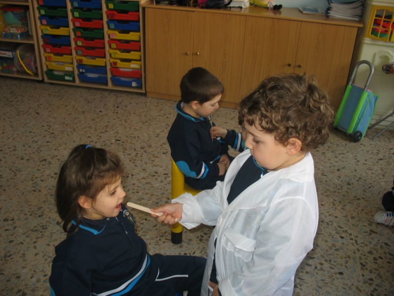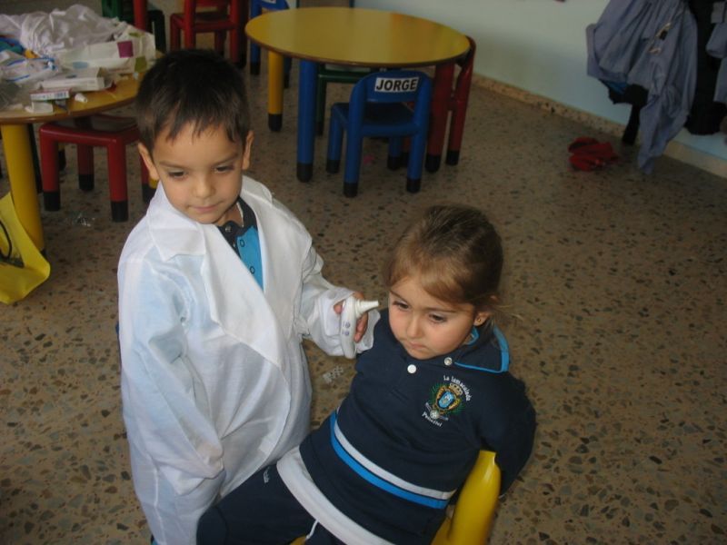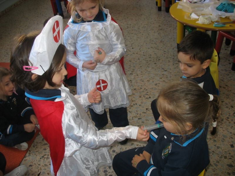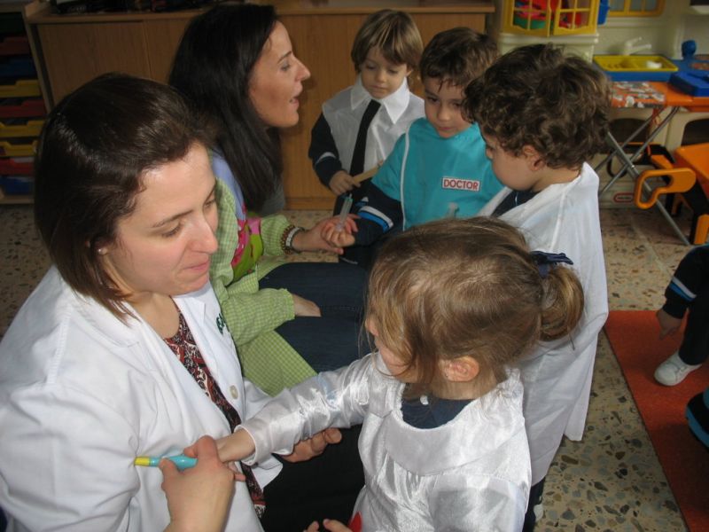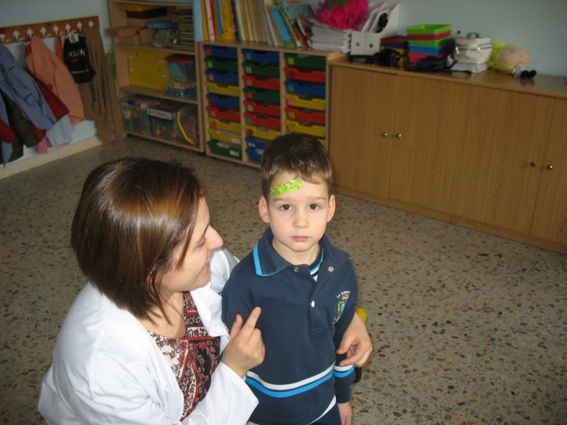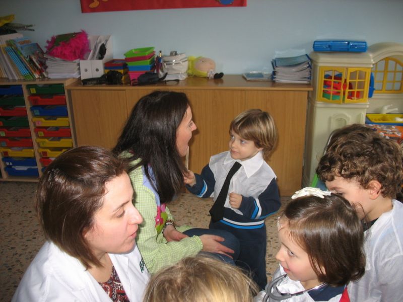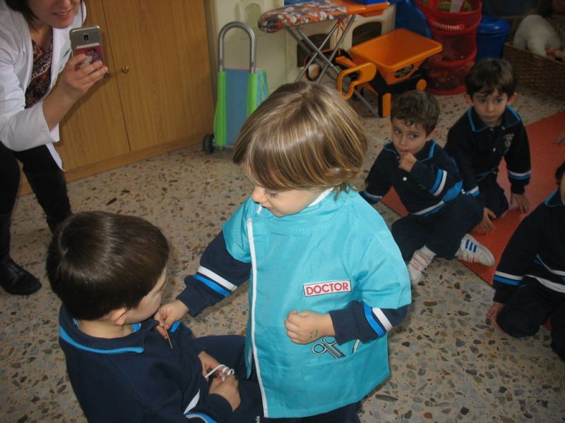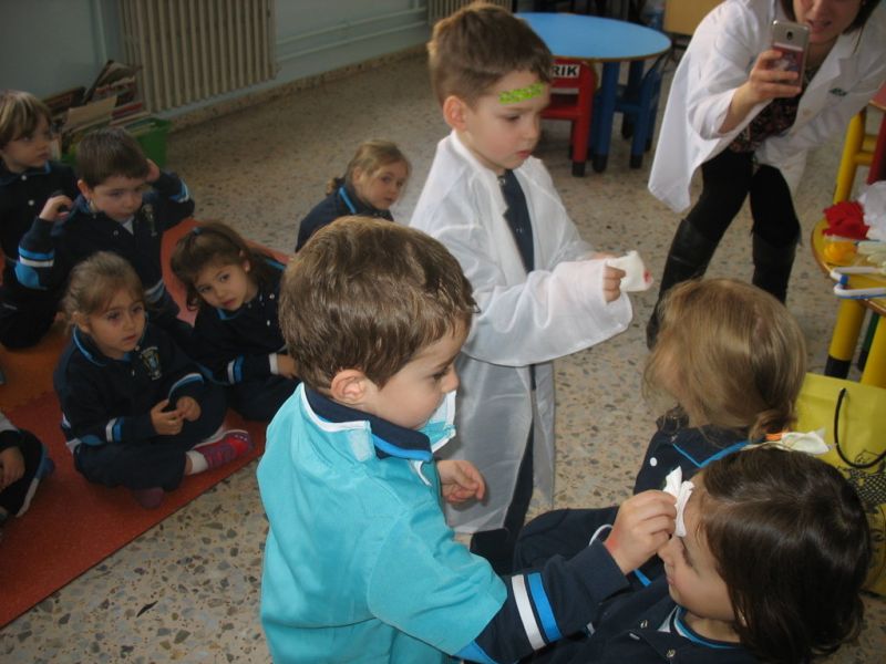 Ayer. los alumnos de 1º de infantil tuvieron una visita muy especial. Una profesional de la enfermería vino a contarnos muchas cosas de cuando nos ponemos malitos o nos hacemos alguna herida. Nos enseñó vendas, termómetros, tiritas, esparadrapos, palitos, etc. Nuestra clase se convirtió en una auténtica enfermería y con su ayuda ya tenemos menos miedo cuando nos hacen una cura o nos ponen una vacuna. Todos querían ser enfermeras y doctores.