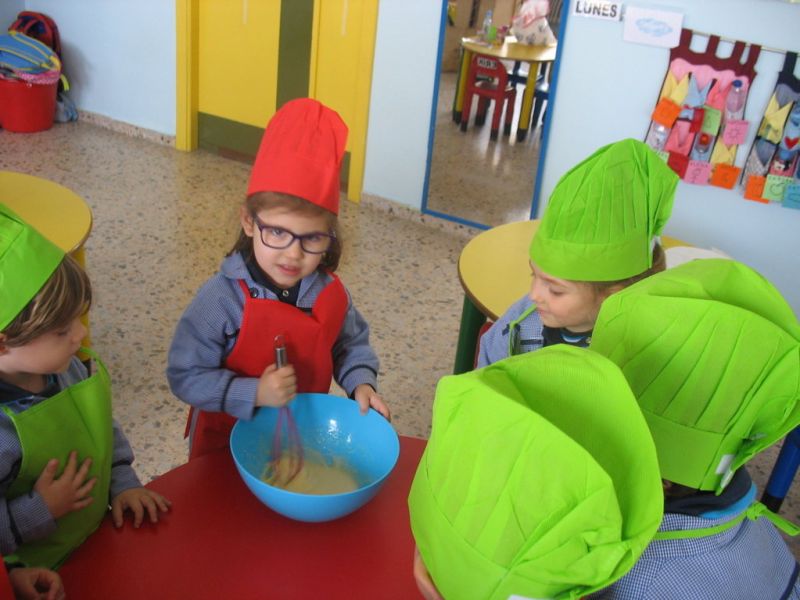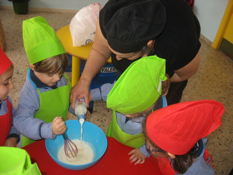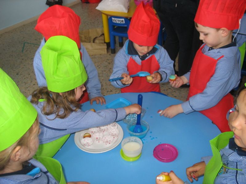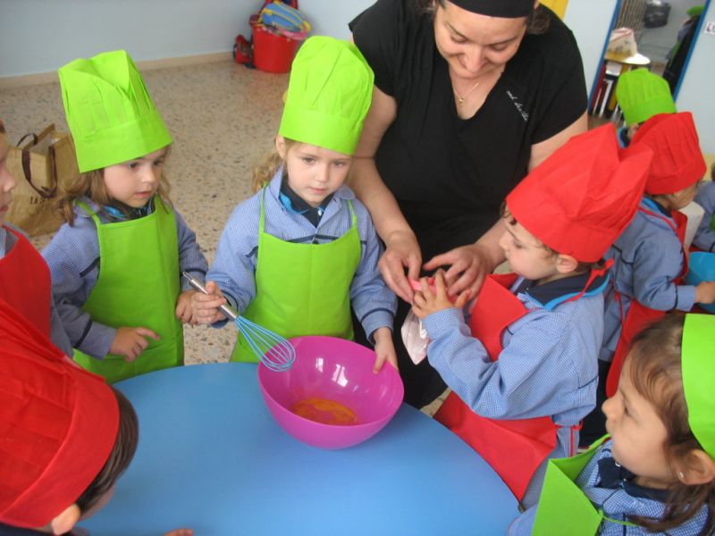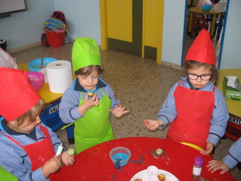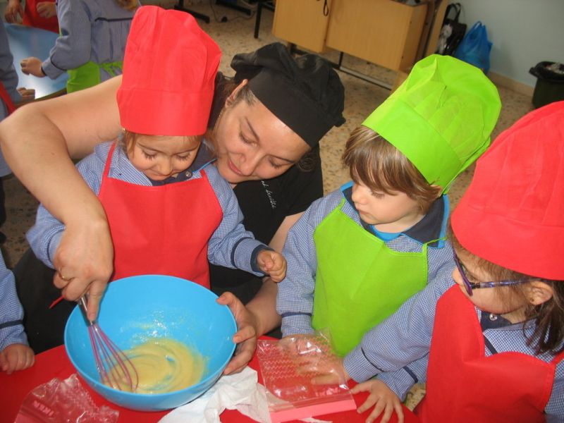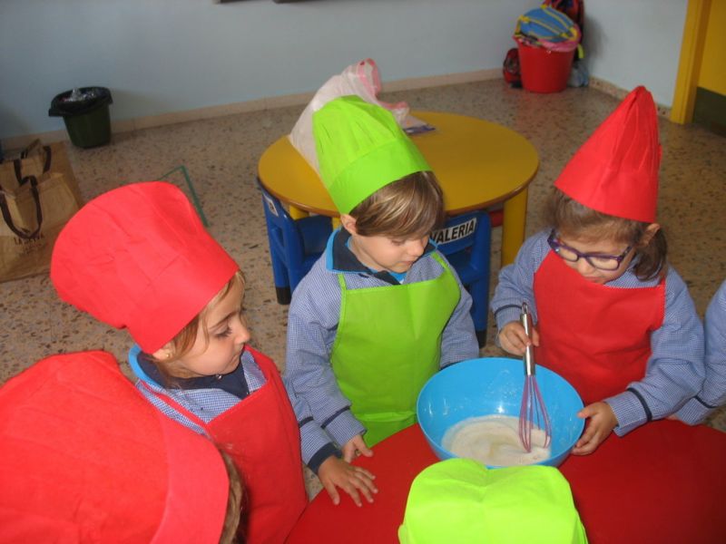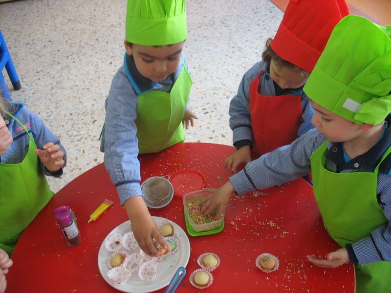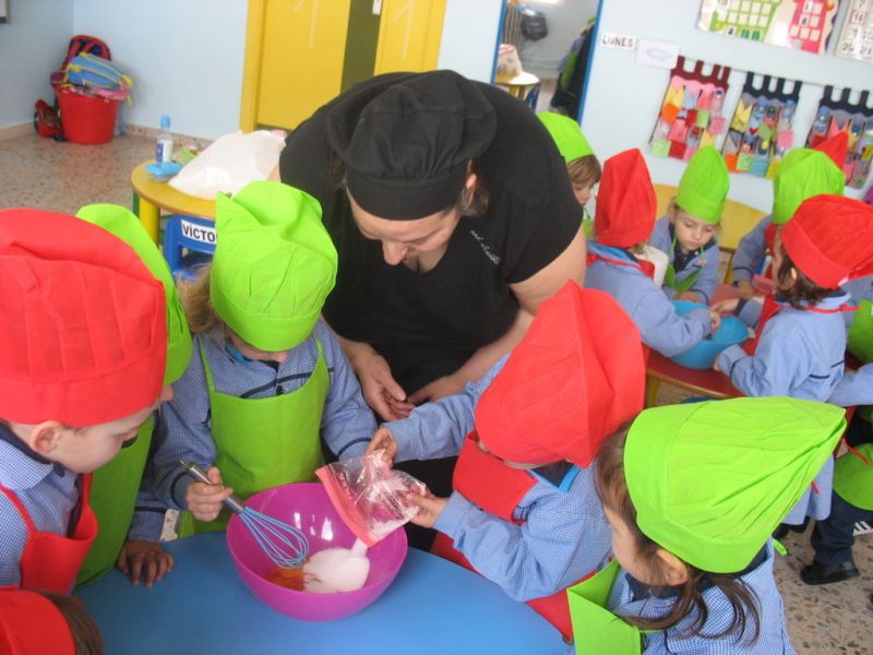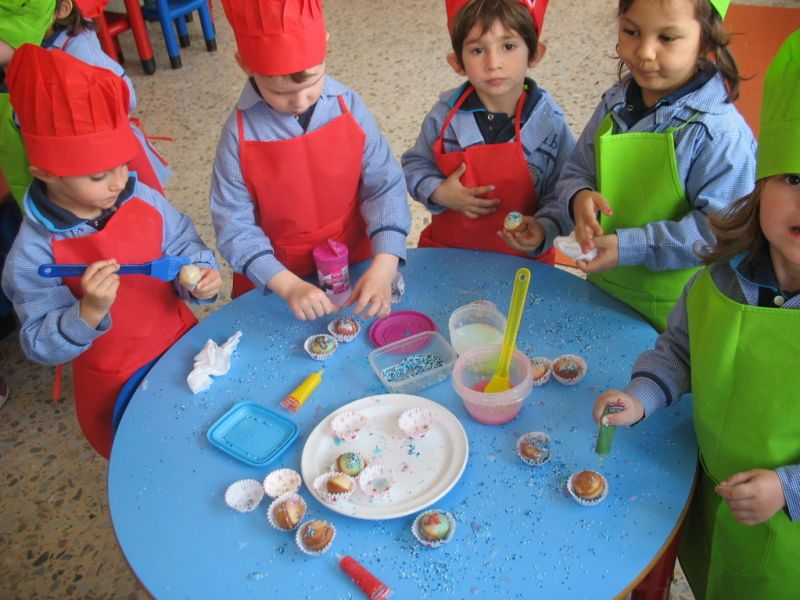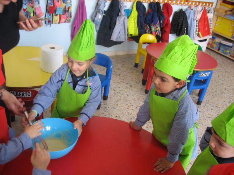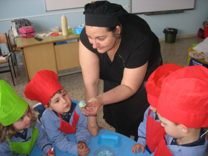 Hoy, los niñ@s de 1º de Infantil han tenido un taller de repostería, han amasado, batido y decorado sus propios dulces, todo de la mano de una experta cocinera.