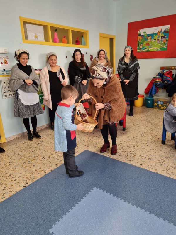 Estábamos todos deseando que llegara este día, para ver a nuestras queridas castañeras. Ataviadas y abrigadas con sus faldas, pañuelos y toquillas fueron por las clases recogiendo las castañas que los niños habían traído. Los alumnos  recitaron poesías propias de esta época otoñal. Las castañeras se fueron con sus cestas llenas de castañas, preparadas para asarlas.