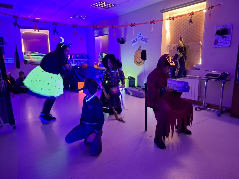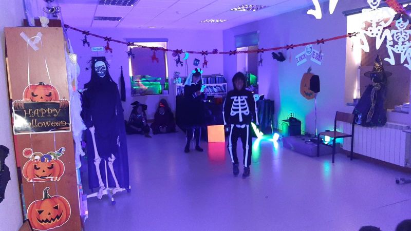 Durante estos días, nuestros alumnos han aprendido muchas cosas sobre esta festividad, costumbres, tradiciones, canciones, poesías, han elaborado manualidades y se lo han pasado terroríficamente bien. Hoy como colofón, los alumnos de sexto de primaria les han preparado una escalofriante sorpresa, han decorado la biblioteca del cole y les han contado cuentos, adivinanzas, poesías, canciones y muchas cosas más.